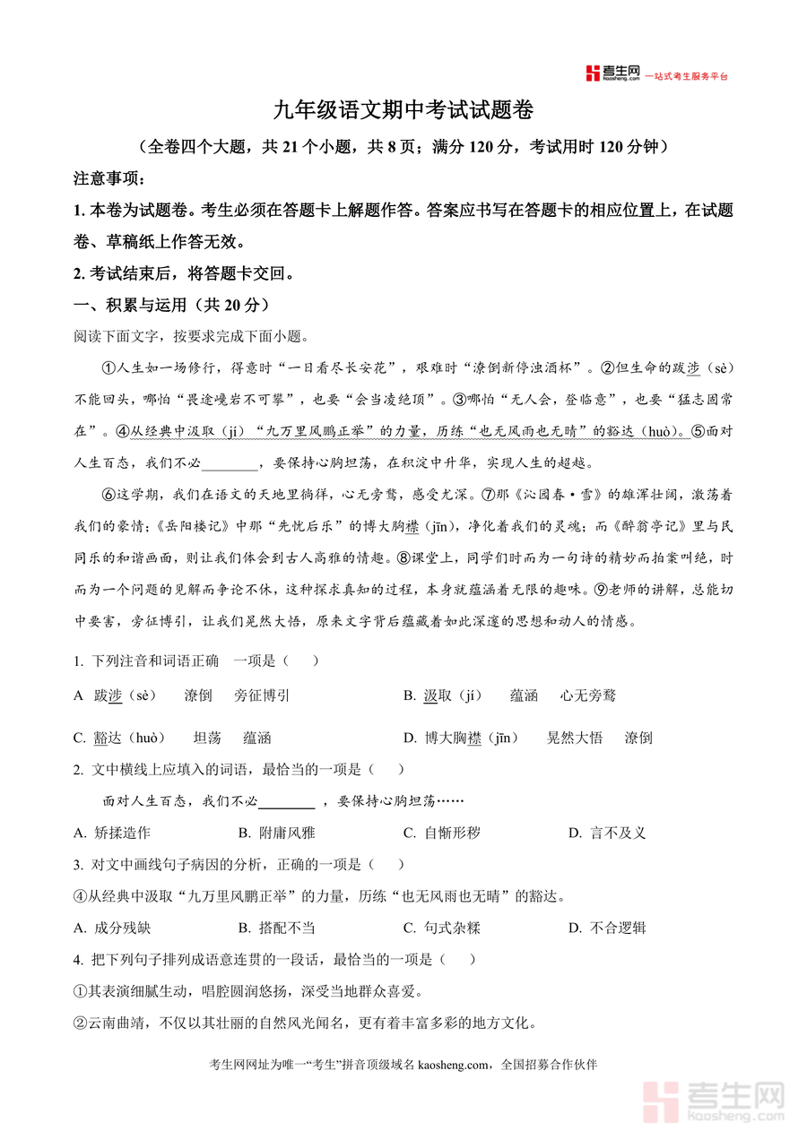 《精品解析:湖南省长沙市宁乡市西部六乡镇2025-2026学年九年级上学期期中语文试题(原卷版).docx》是一份针对区域九年级学生设计且贴合本地教学实际的期中语文备考资料,核心定位为真题还原与考点梳理双重功能结合。资料涵盖积累与运用、名篇名句默写、综合性学习、古诗文阅读、非连续性文本阅读及文学类文本阅读等完整题型模块;特色亮点在于题目紧扣部编版教材重点篇目(如《沁园春·雪》《岳阳楼记》等)且严格遵循期中测试时间与分值设置,并融入本地教学进度需求——确保内容兼具权威性与实用性