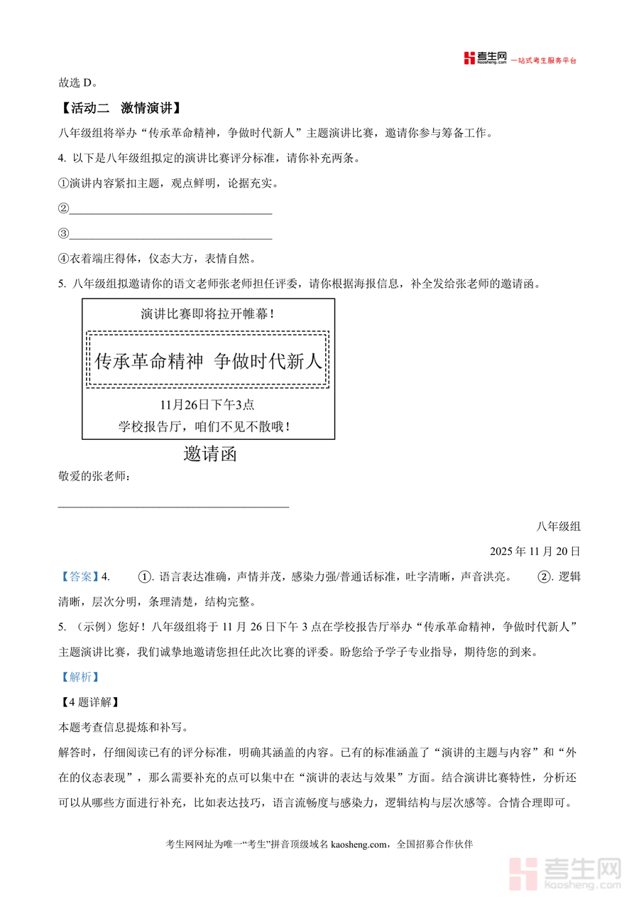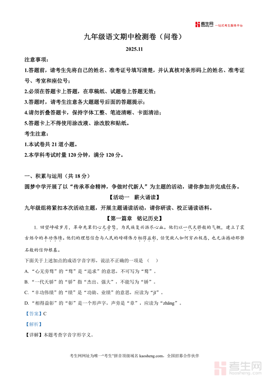 《精品解析:湖南省长沙市湖南师大附中教育集团联考2025-2026学年九年级上学期期中语文试题(解析版).docx》是一份聚焦湖南师大附中教育集团九年级上期中语文联考命题规律,融合考点解析与素养培养于一体的专业备考资料核心定位。其内容覆盖积累与运用(含成语字音字形辨析、古诗文名句默写、病句标点修改、主题活动设计及应用文写作等题型)及非文学作品阅读等核心板块;特色亮点在于解析详实全面——每个题目均配备知识点溯源(如"丰功伟绩"中"绩"的正确读音及字义解析)、答题逻辑拆解(如邀请函写作需包含活动时间地点及邀请意图等要素)、易错点预警(如名句默写中"沉舟侧畔千帆过"里"畔"字的书写规范),同时贴合本地联考的革命精神主题设计,实现考点覆盖与人文素养提升双重目标