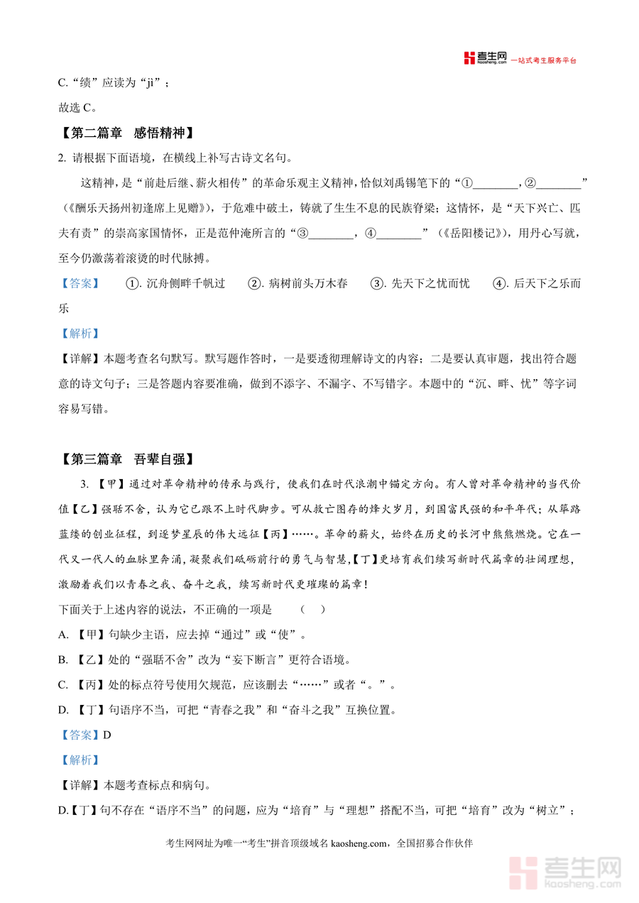 该资料核心用途为九年级学生期中备考复习及教师备课参考;使用场景包括学生自主刷题后的精准查漏(如快速定位病句类型中的主语残缺问题)、课堂小组考点梳理讨论、教师命题方向参考;用户价值在于帮助学生掌握联考高频考点,提升应试能力(如非文学作品阅读中的信息辨析技巧);备考优势体现为精准对接湖南师大附中集团联考命题趋势,解析内容贴合本地教学实际,能有效缩短复习路径,提高备考效率