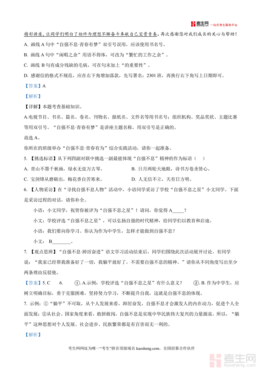该资料核心用途为提升九年级学生语文应试能力,适用于日常知识点巩固(如专项训练积累运用模块)、考前冲刺复习(熟悉本地题型分布)及错题深度分析(明确失分原因与解题思路)?其用户价值在于精准匹配长沙县联考命题风格,帮助学生掌握解题技巧:例如综合实践中思辨题引导多角度反驳"躺平"观点,非文学阅读指导材料信息整合方法;备考优势在于通过系统解析缩短复习路径,助力学生针对性突破薄弱环节,高效提升得分能力?