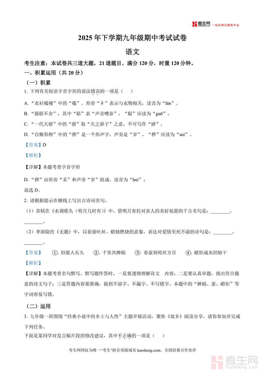《精品解析:湖南省长沙市雅礼教育集团2025-2026学年九年级上学期期中语文试题(解析版)》是一份聚焦九年级语文期中备考需求、融合雅礼教育集团命题特色真题解析资料覆盖积累运用(字音字形名句默写语言运用)阅读(非文学文本分析小说阅读等)及写作三大核心板块每道试题均配备详实解析不仅明确答案正误依据如字音字形题中对"秽"字声旁与读音关系分析还关联中考考点标注易错点(如病句题两面对一面语病类型)并拓展解题思路(如情景对话补写逻辑衔接技巧)全面呈现命题规律与考察方向