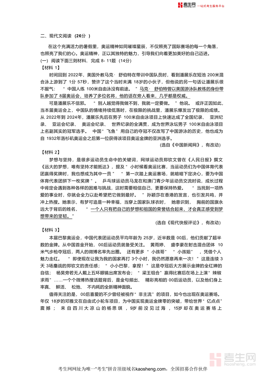 《湖南省长沙市天心区2024-2025学年九年级上学期开学考试语文试卷.docx》是一份聚焦九年级语文开学阶段学习质量检测需求,贴合天心区区域教学实际与考纲要求的标准化备考资料。试卷涵盖古诗文阅读(含王绩《野望》、王维《新晴野望》及郦道元《西陵峡》等经典篇目解读)、现代文阅读(围绕奥运精神主题展开多材料文本分析与专题文章研讨)两大核心模块,题型包含选择题、断句题、炼字赏析题、论述题等,全面覆盖九年级语文核心考点与能力维度;其特色亮点在于结合区域教研方向,融入最新时事素材(如巴黎奥运会相关内容)与传统经典文本,实现时效性与文化性有机结合,同时严格遵循90分钟考试时长、100分满分设置,还原真实考试场景以帮助使用者提前适应节奏。