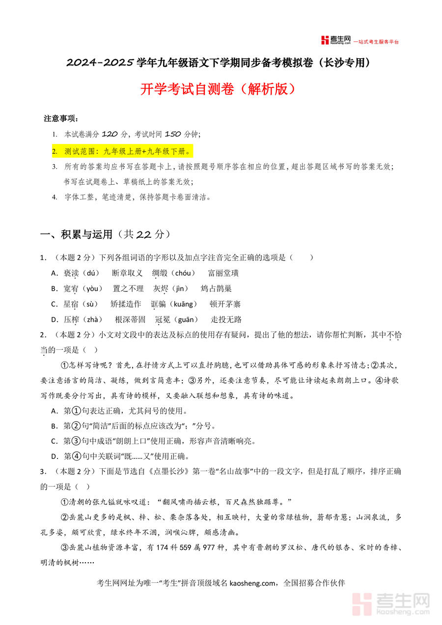 《【长沙专用】开学考试自测卷(原卷版).docx》是一份针对长沙地区九年级学生设计开发同步备考模拟卷原卷版文件内容涵盖积累运用古诗文阅读非连续文本阅读等多元题型严格遵循本地考纲要求结构完整且题目设置贴合长沙地区考试特点特色亮点突出