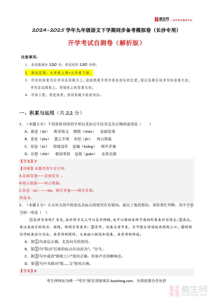本资料适用于长沙地区九年级学生,特别是下学期开学前需要进行自我评估与系统备考者。作为长沙专用且覆盖全学期知识点的解析版自测卷,它具有不可替代性:贴合本地命题趋势,解析详实深入,能满足本地化备考需求;长期价值在于巩固知识体系,培养独立解题思维,助力学生在开学考试及后续升学考试中取得优异成绩,是九年级语文备考不可或缺的实用资料之一。