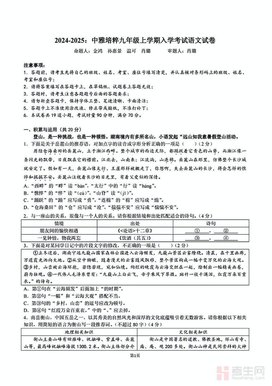 本试题适用于长沙中雅培粹中学九年级在读学生、计划报考该校的初三学生,以及关注长沙中考语文命题趋势的教师与家长群体。作为该校官方发布的开学测试试题,它具有不可替代性,能真实反映学校对学生的能力要求;长期来看,通过分析试题中的高频考点与题型规律,学生可建立科学的备考思维,为中考语文取得优异成绩奠定坚实基础。