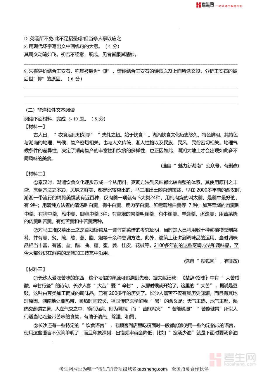 《湖南省长沙市长沙外国语学校2024秋九上入学考语文(问卷).docx》是一份针对初三学生入学阶段语文能力评估的专业备考资料,涵盖积累与运用(含字音字形辨析、语病标点判断、文学常识及古诗文默写等基础题型)、阅读与理解(含古诗文阅读、非连续性文本阅读等综合题型)两大核心模块;其特色在于贴合长沙本地教学实际,融入湖湘文化元素(如非连续性文本对湖湘饮食文化的考查)及经典文学内容(如王安石诗文及传记阅读),能全面检测学生的语文基础与综合素养,为后续学习提供精准依据.
