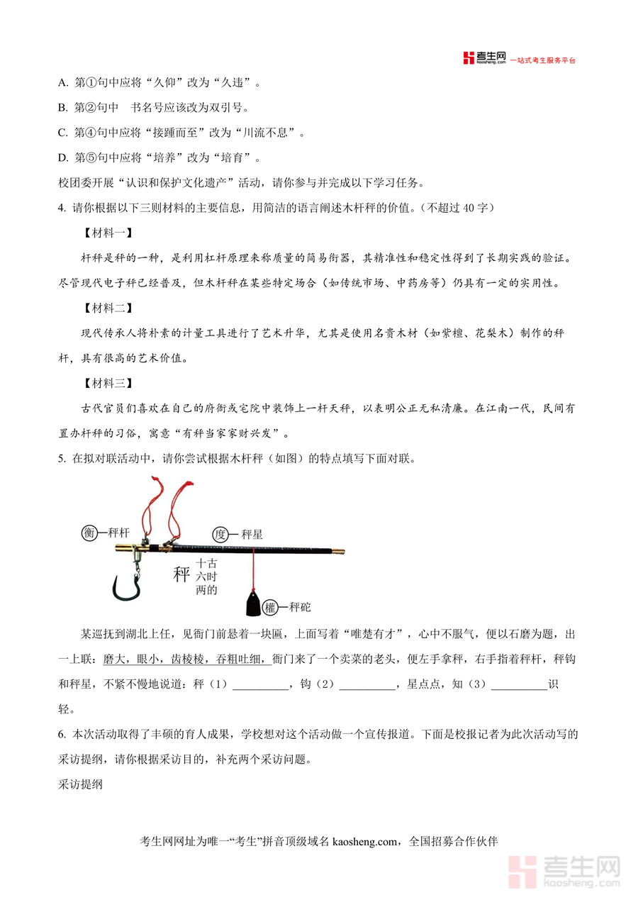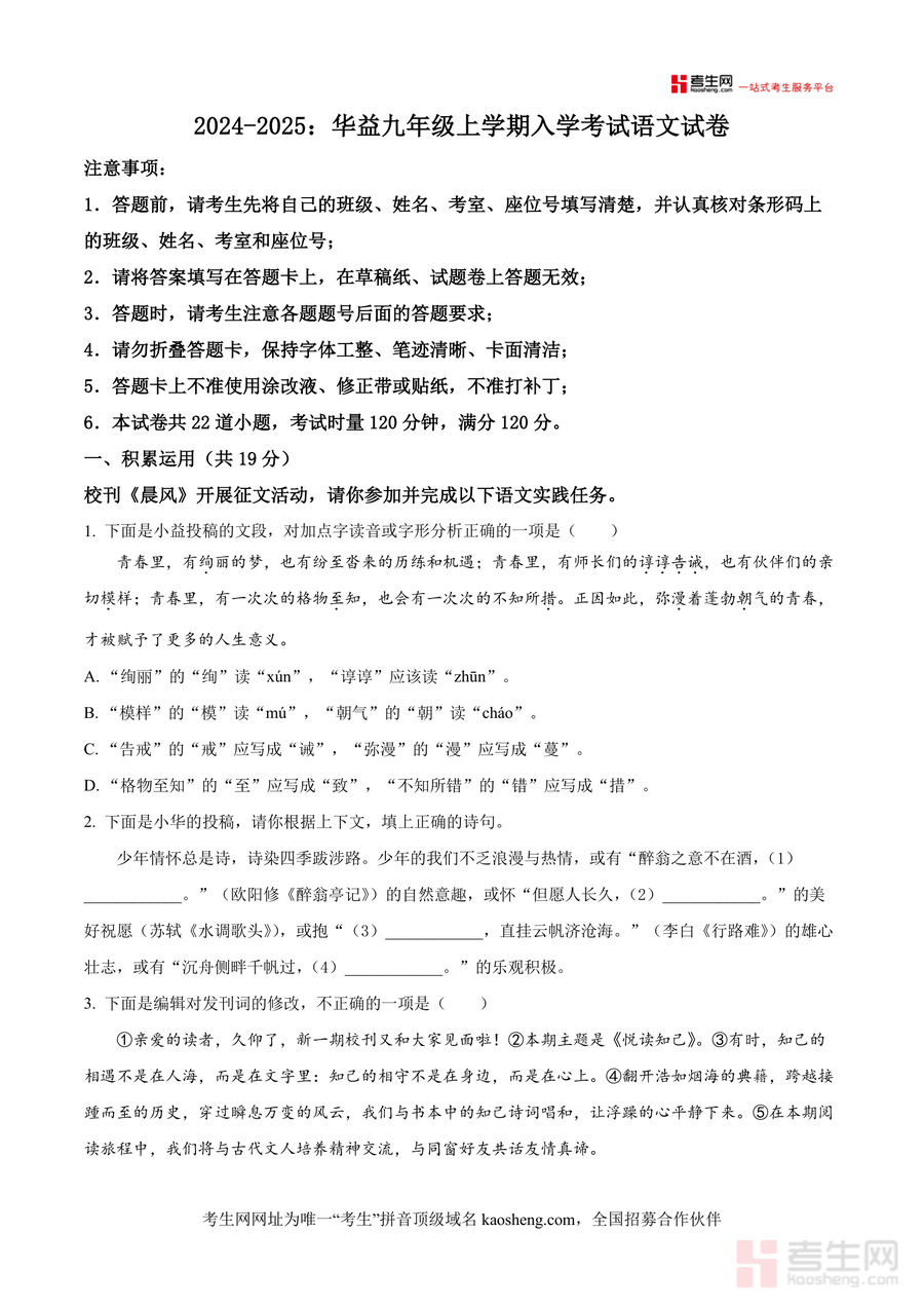 《精品解析:湖南省长沙市华益中学2024-2025学年九年级上学期开学测试语文试题(原卷版).docx》是一份聚焦该校九年级开学适应性评估需求的语文原卷备考资料,涵盖积累运用(字音字形辨析、古诗文默写与理解、病句修改及文化遗产实践任务)、阅读理解(古诗文阅读、非文学作品阅读、文学作品阅读)等中考核心模块题型,考试时长120分钟、满分120分,严格遵循该校教学大纲与长沙中考命题方向,试题设计兼顾基础巩固与能力拓展,能精准反映学生暑期知识掌握程度及语文核心素养水平,为新学期教学规划与备考策略制定提供数据支撑。