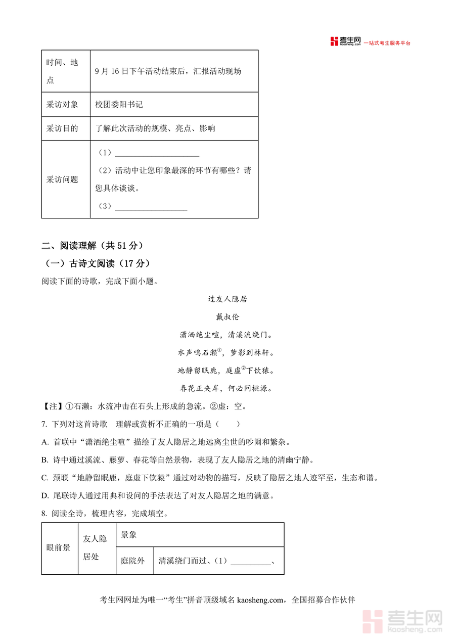 该资料核心用途为九年级学生开学前自测诊断,帮助学生快速熟悉开学测题型结构与难度层次,定位暑期学习漏洞;同时可作为教师备课辅助资源,助力设计针对性教学方案。使用场景包括学生自主练习提升应试能力、家庭辅导检测学习效果、班级统一模拟评估学情等;用户价值在于通过真实原卷训练掌握开学测高频考点与答题规范;备考优势体现在提前适应九年级语文考试节奏,有效衔接暑期学习与新学期课程内容,为中考系统复习筑牢基础框架。