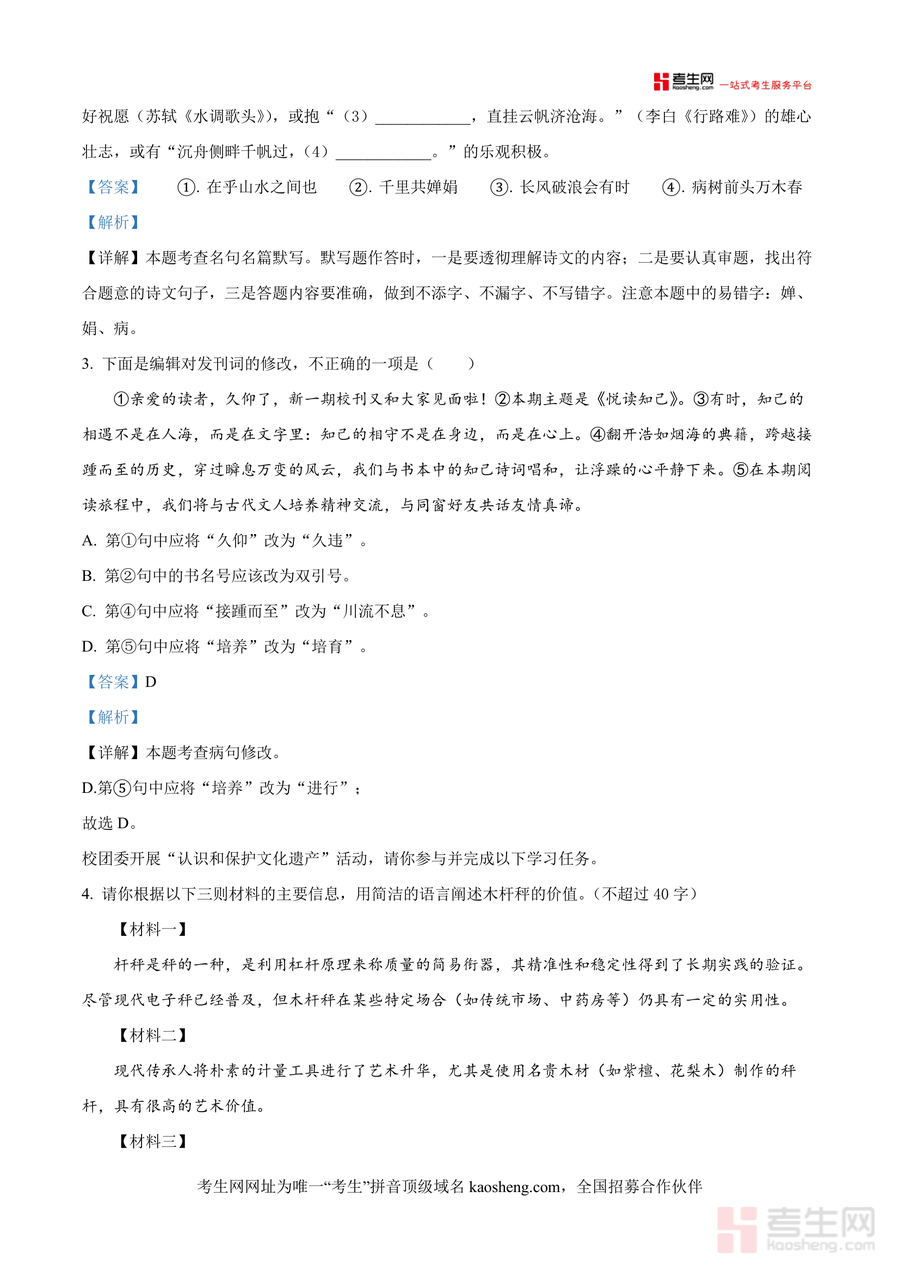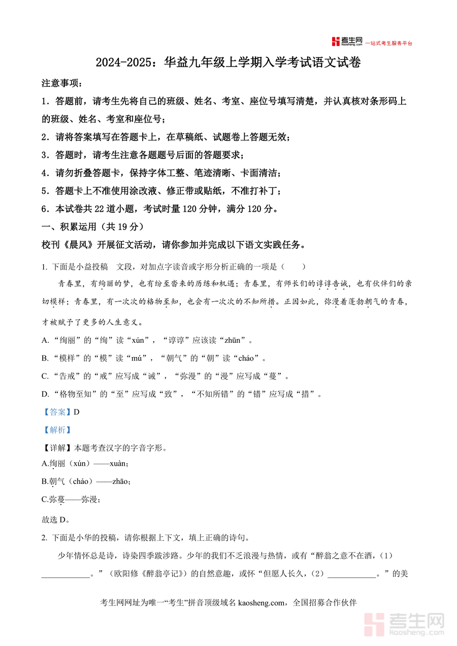适用人群主要为华益中学九年级学生及同地区同年级备战中考语文 的学习者,同时可供初中语文教师作为教学案例参考;总结而言,这份资料作为真题解析类资料,其真题权威性与解析专业性使其成为九年级语文开学备考不可或缺资源——不仅能帮助学生高效应对开学测试,更能为后续中考复习构建扎实知识框架并培养良好解题思维习惯,具有长期实用价值与指导意义