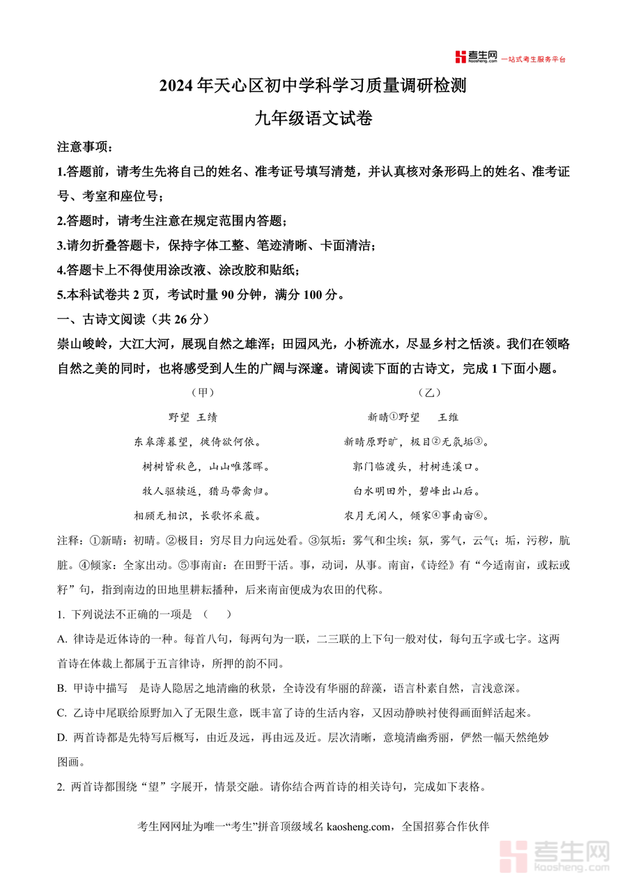 适用人群为长沙市天心区及周边区域九年级学生、初中语文教师及备考指导者;该资料作为区域开学考试原卷,具有不可替代权威性与参考价值;其必要性在于能帮助师生及时掌握本地教学质量要求与命题方向,长期价值则体现在为后续中考语文备考积累实战经验与知识储备,是九年级语文学习起始阶段不可或缺的重要参考资料。