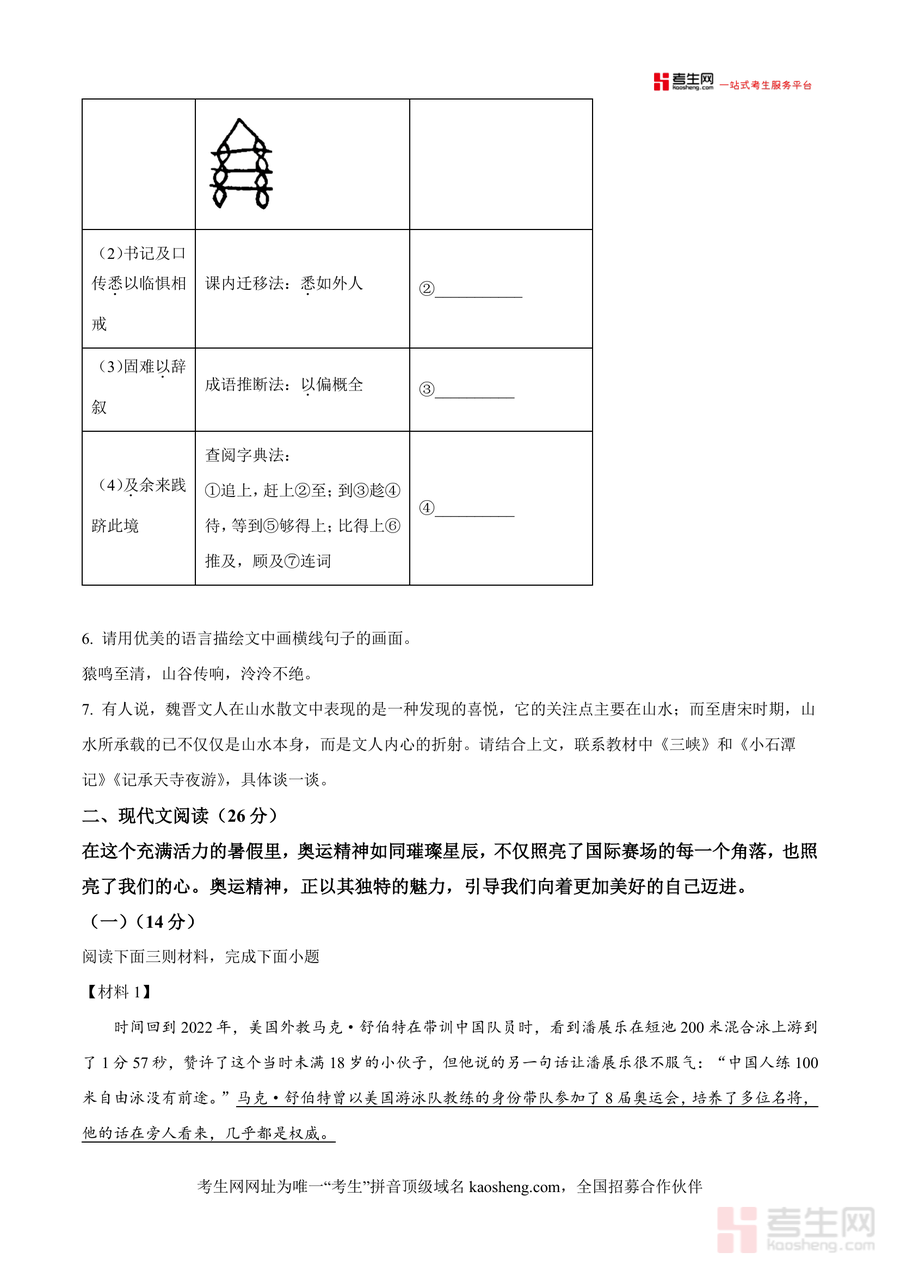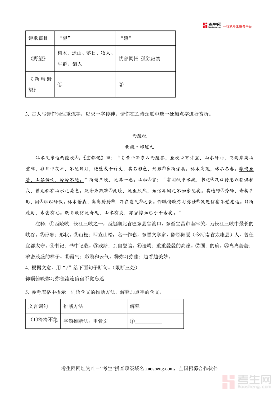 《精品解析:湖南省长沙市天心区2024-2025学年九年级上学期开学考试语文试题(原卷版).docx》是一份聚焦区域教学实际、服务九年级学生语文开学检测需求的优质备考资料;其主要内容涵盖古诗文阅读(含王绩《野望》与王维《新晴野望》对比赏析、郦道元《西陵峡》文言解读)、现代文阅读(以奥运精神为主题多材料分析、运动员心理素质培养专题文章)及名著阅读(革命岁月相关选段)三大核心模块,同时包含规范答题要求与典型题型示例;特色亮点在于严格遵循本地教学大纲导向,题型设置贴合区域考试命题趋势,注重文本解读能力与应试技巧结合考查。