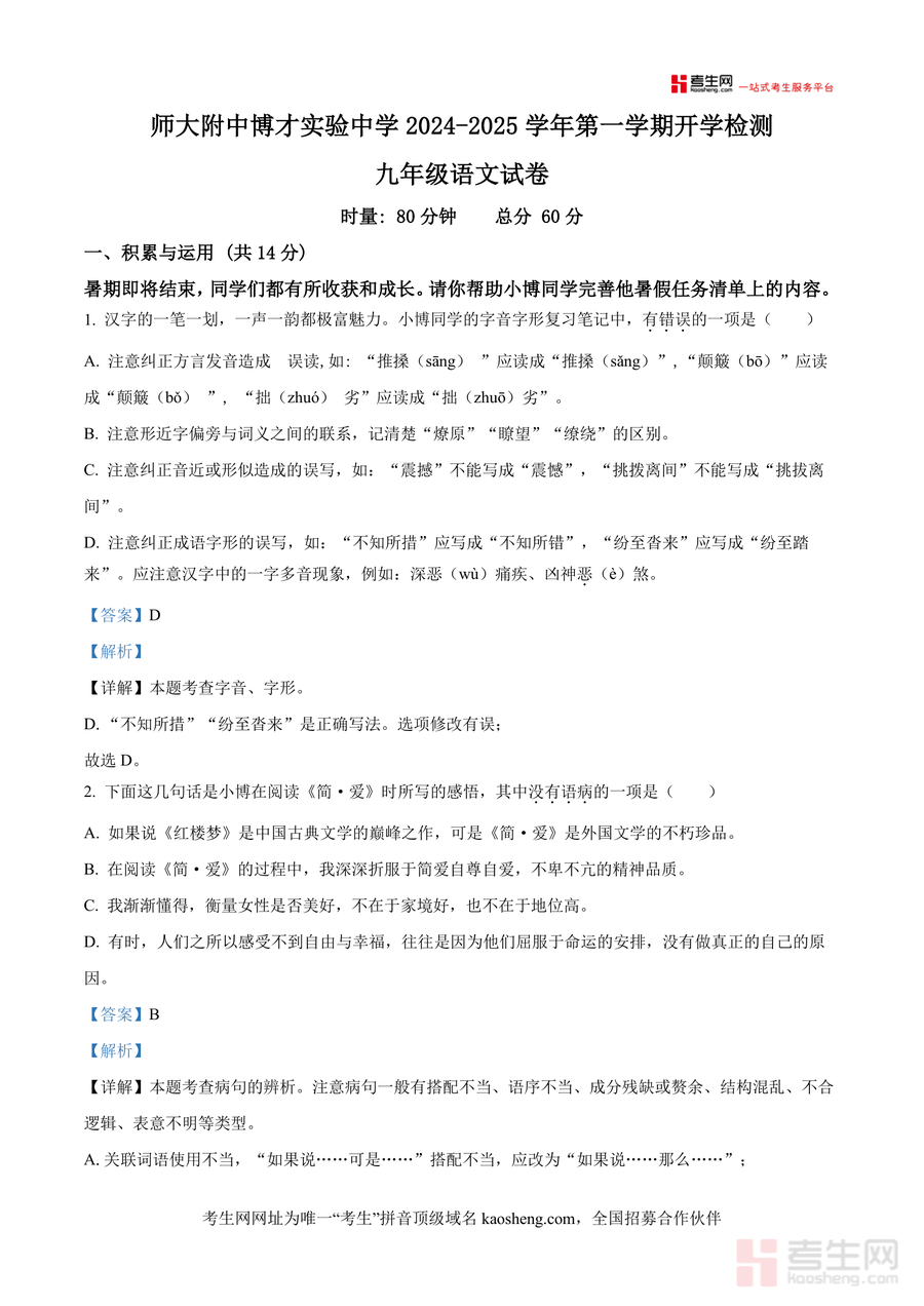 《精品解析:湖南省长沙市师大附中博才实验中学2024-2025学年九年级上学期开学考试语文试题(解析版).docx》是一份聚焦九年级开学阶段语文知识掌握情况评估需求打造 的专业备考资料,包含完整真题及逐题深度解析。资料覆盖积累与运用、阅读与理解两大核心模块,涵盖字音字形辨析、病句修改、古诗文默写、文言文阅读等典型题型;其特色亮点在于解析部分不仅给出标准答案,更针对易错点(如"纷至沓来"字形混淆)、答题逻辑(如语句排序思路梳理)进行细致拆解,融入长沙本地学情特点,是兼具真题权威性与解析专业性的优质学习资源,有效助力使用者把握核心考点。
