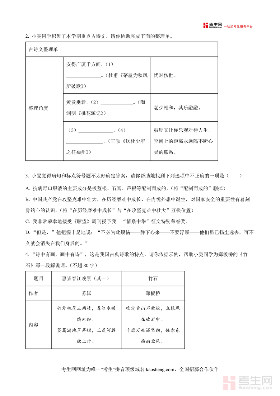 该资料核心用途是检测学生暑假及前两年初中语文学习成果,明确初三学习起点;使用场景覆盖学生开学前自主预习检测、教师开学后摸底评估及课堂练习拓展;用户价值在于通过真题训练提升应试能力,精准定位字音字形、古诗文理解等薄弱知识点;备考优势体现在原卷严格遵循中考时间与分值要求,有效培养学生时间管理能力与答题规范意识,提前适应初三考试节奏,为后续复习规划提供方向指引。