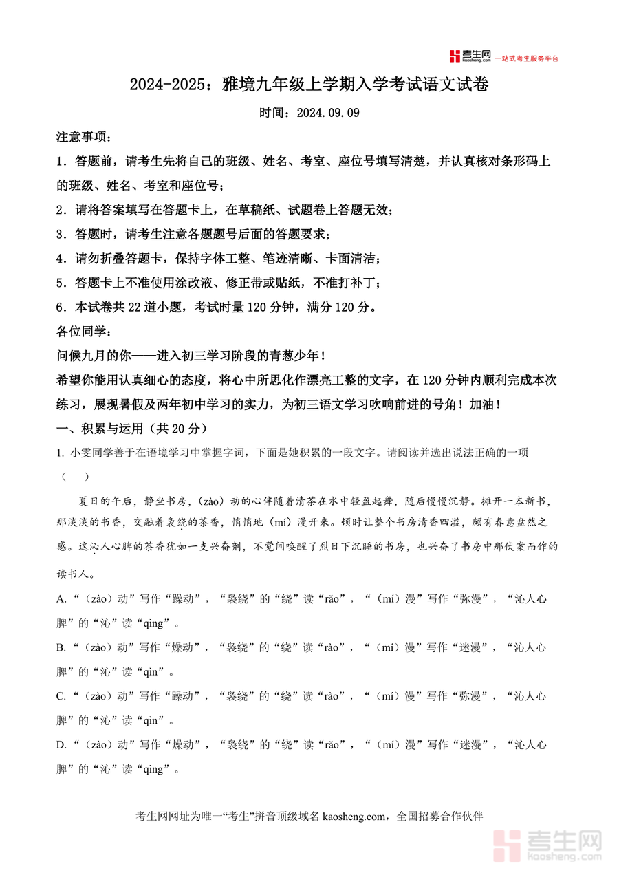 《精品解析:湖南省长沙市雅境中学2024-2025学年九年级上学期开学测试语文试题(原卷版).docx》是一份针对长沙雅境中学九年级学生设计的开学摸底语文原卷资料,核心定位为初三语文备考精准诊断工具,主要内容涵盖积累与运用(含字音字形辨析、古诗文整理、病句标点判断等7道小题)、阅读与鉴赏(含古诗词鉴赏、文言文阅读、非文学作品阅读及现代文阅读等板块)共22道小题,考试时长120分钟,满分120分,特色亮点在于依托雅境中学优质教学资源,题型贴合长沙中考命题趋势,真实还原名校测试场景,助力学生快速衔接初三学习节奏。