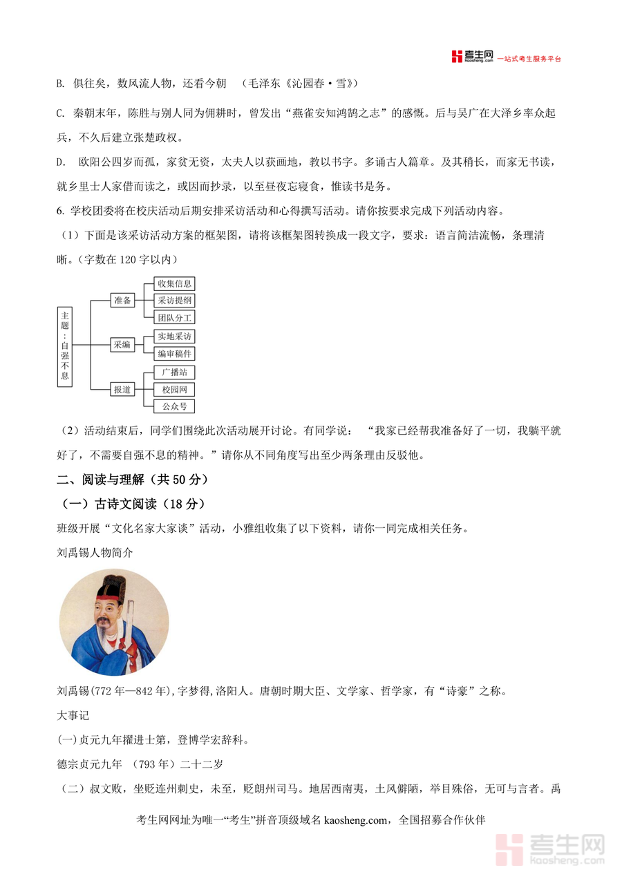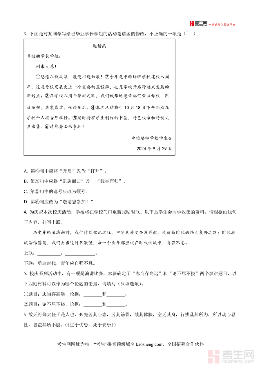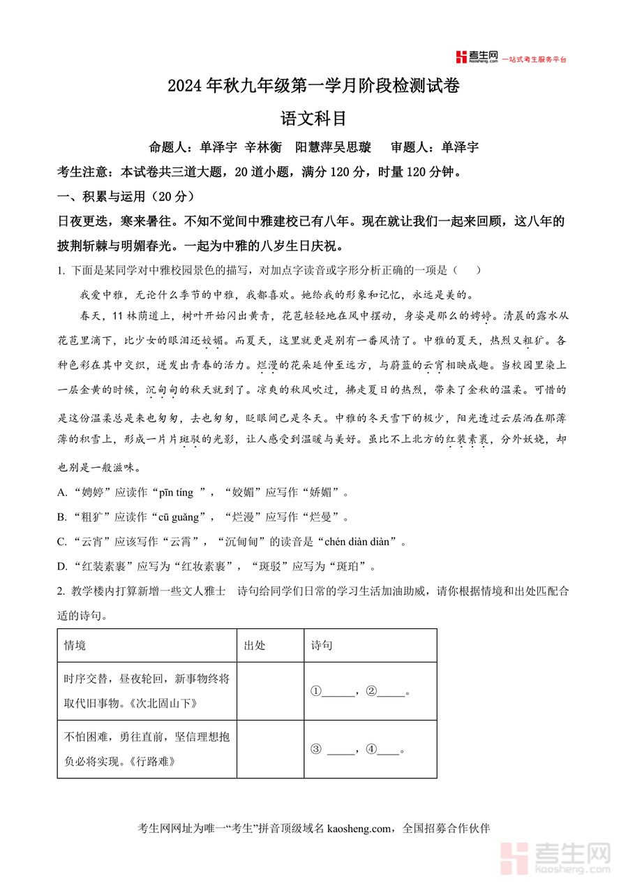 《精品解析:湖南省长沙市中雅培粹学校2024-2025学年九年级上学期第一次月考语文试题(原卷版).docx》是一份针对九年级学生设计的高质量语文备考资料,核心定位为长沙本地名校月考真题范本。文件包含积累与运用(字音字形辨析、诗句匹配、语病修改等)及阅读与理解(古诗文赏析、非文学作品阅读、文学作品阅读)两大核心模块共20道小题,全面覆盖九年级上册语文核心知识点与能力要求;其特色亮点在于命题团队由资深教师组成,试题紧密结合中雅建校八周年校庆主题设计情境化题目,同时融入刘禹锡诗文赏析等经典文化内容,兼具地方特色与学科深度,为考生提供真实真题训练体验,助力夯实应试基础与提升解题能力