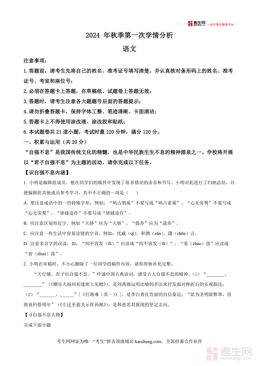 《精品解析:湖南省长沙市长郡集团2024-2025学年九年级上上学期第一次月考语文试题(原卷版).docx》是一份聚焦长沙本地学情的九年级语文备考资料,涵盖积累与运用运用、古诗文阅读、非文学作品阅读及文学作品阅读四大核心模块;其特色在于结合“君子自强不息”传统文化主题设题,并融入叶嘉莹吟诵非遗内容、陆游文言文经典文本解析等元素,能帮助学生直观把握真题命题规律与考查重点,为备考提供精准指引哒~