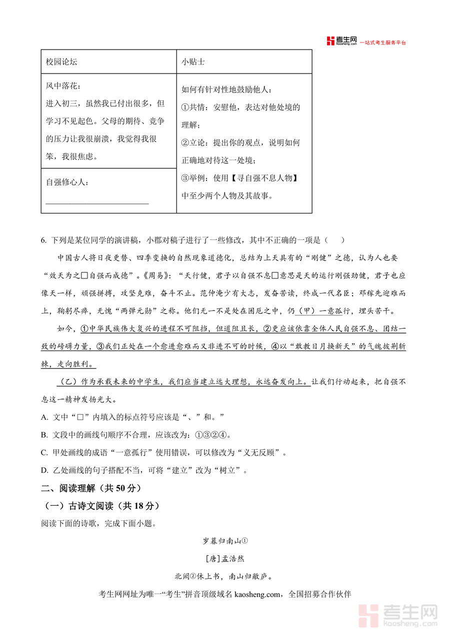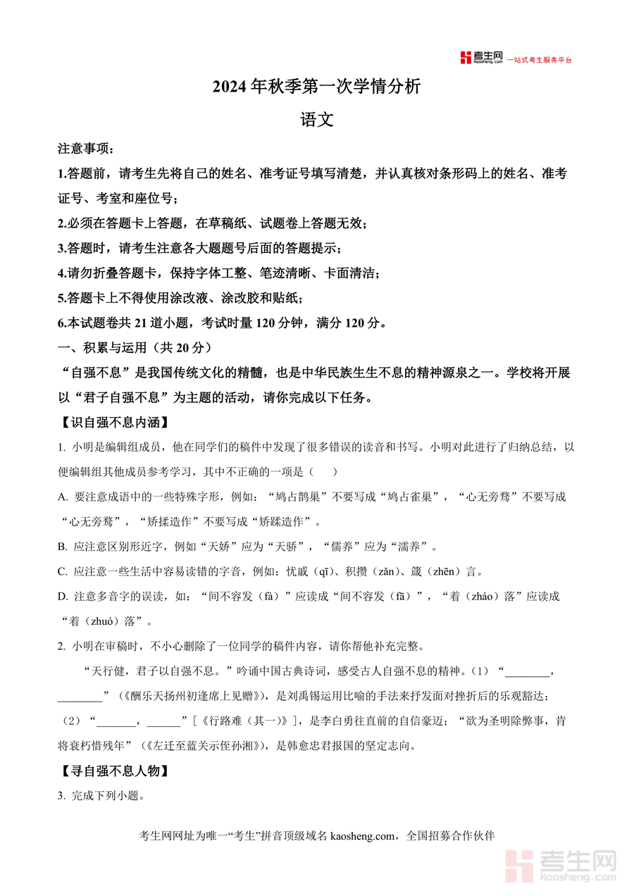《精品解析:湖南省长沙市麓共体联考2024-2025学年九年级9月月考语文试题(原卷版).docx》是一份针对长沙麓共体区域九年级秋季开学首次学情分析设计的权威备考资料,包含积累与运用(以"君子自强不息"主题活动为载体,覆盖字音字形、古诗文默写、语言运用等考点)、阅读理解(古诗文阅读、非文学作品阅读、文学作品阅读三大模块)等核心内容,特色亮点在于贴合本地联考命题趋势,紧密对接中考语文核心素养要求,题型设置兼顾基础夯实与能力提升,如"吟诵"相关非文学作品阅读题既考查信息提取能力,又渗透传统文化传承意识.