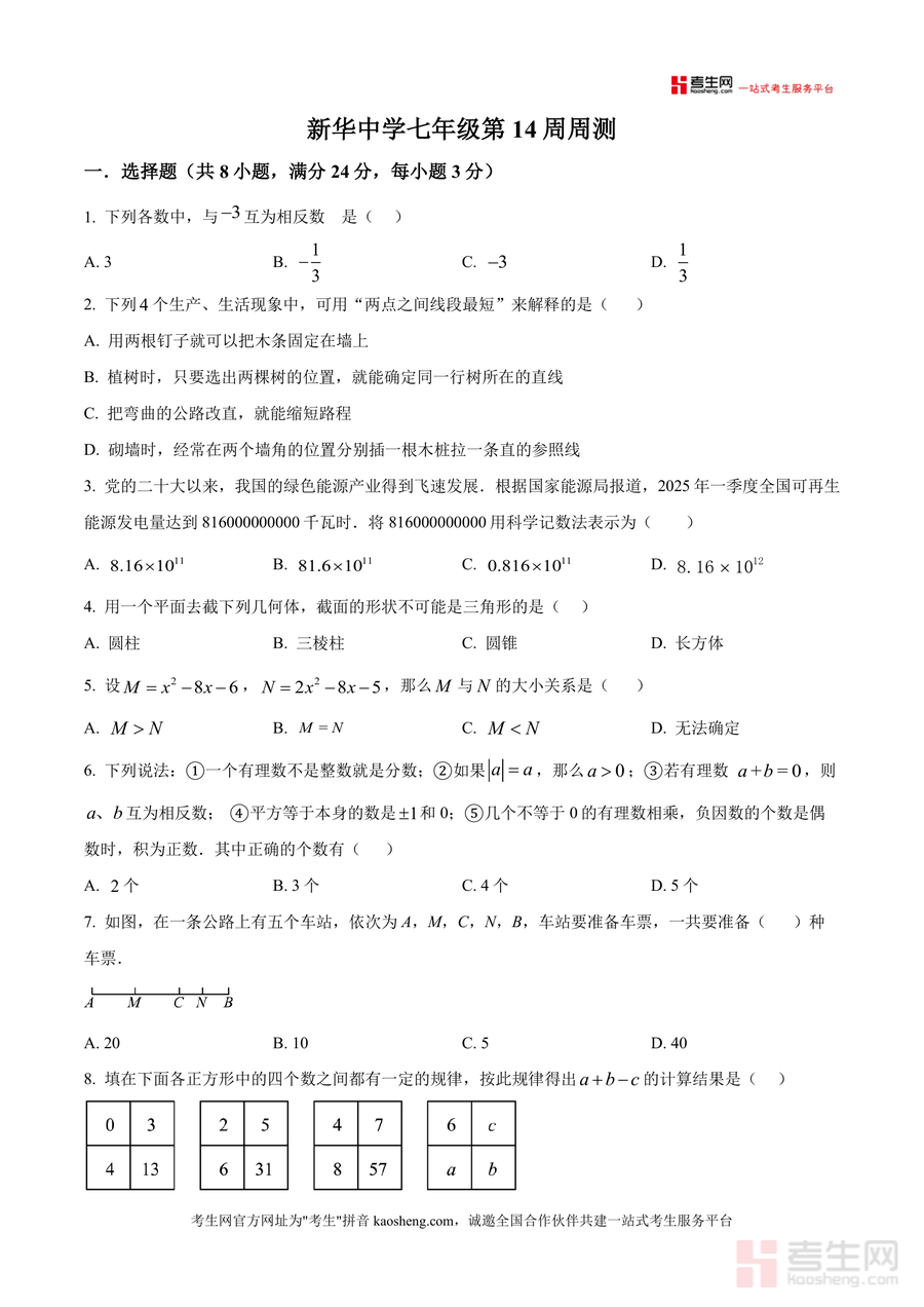 《精品解析:广东省深圳市新华中学2025-2026学年七年级上学期数学周测试卷(14)(原卷版).docx》是一份针对广东省深圳市新华中学七年级上学期数学第14周学习内容设计的阶段性备考资料。试卷包含选择题8小题(满分24分)、填空题5小题(满分20分)及解答题6小题,覆盖相反数概念、科学记数法表示大数、几何图形截面判断、数轴与代数式运算、角平分线性质、实际问题中的运输费用计算等核心知识点。其特色在于严格贴合新华中学教学进度与本地数学考情导向,题型设置与难度梯度符合七年级学生认知水平,能精准反映本周学习重点与高频易错点。