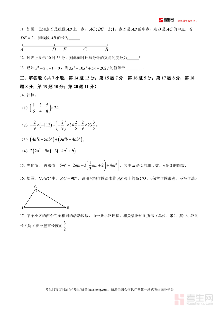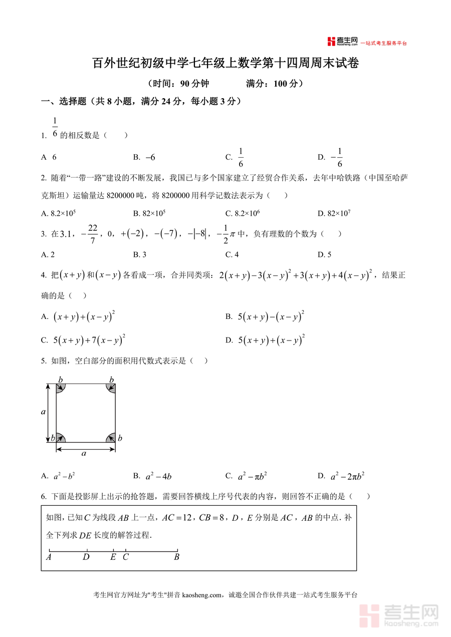 《精品解析:广东省深圳市龙岗区百外世纪初级中学2025-2026学年七年级上学期数学第十四周周测(原卷版)》是一份针对七年级上学期数学阶段性学习成果检测的标准化原卷资料。该资料严格遵循百外世纪初级中学教学进度安排,涵盖相反数、科学记数法、同类项合并、代数式应用、几何作图、角平分线与旋转等核心知识点,题型设置包含8小题选择题、5小题填空题及7小题解答题三大模块,题目梯度合理,既注重基础概念的理解与应用,又融入拓展性思维训练。其特色在于贴合深圳龙岗区初中数学命题趋势,能精准反映本校教学重点与学生能力要求,为师生提供真实的检测场景参考。