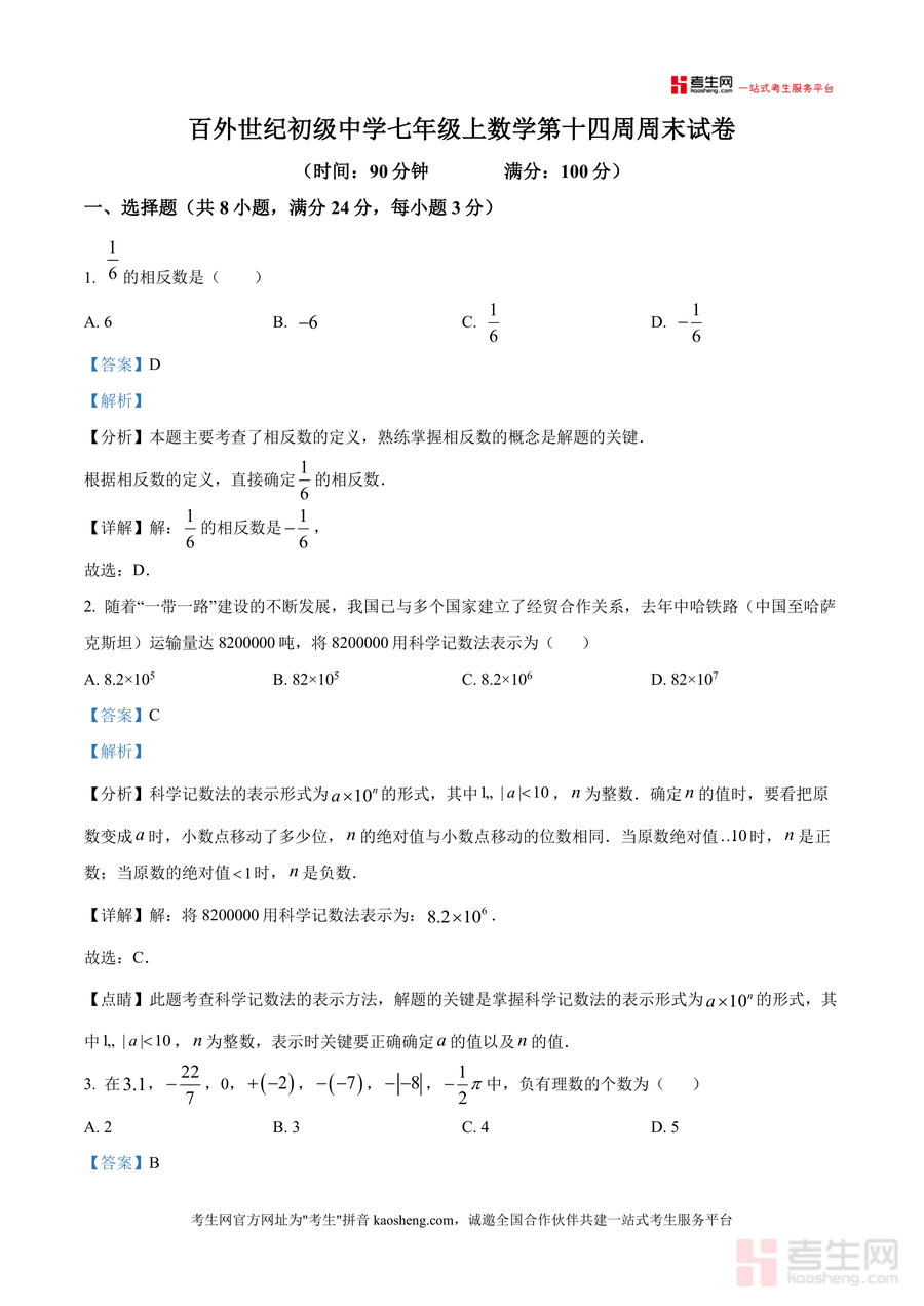《精品解析:广东省深圳市龙岗区百外世纪初级中学2025-2026学年七年级上学期数学第十四周周测(解析版).docx》是一份针对该校七年级学生数学周测需求的专业备考资料,包含选择题(8道)、填空题(5道)、解答题(7道)共三类题型及完整解析。其核心特色在于每道题均结合考点深度剖析:如选择题中对相反数定义、科学记数法规则的精准解读,填空题里绝对值非负性与一元一次方程定义的应用,解答题中整式化简求值、几何作图及角度旋转问题等核心知识点的细致讲解;同时融入解题思路引导与易错点提示,如钟表夹角计算时对时针分针转速差异分析,确保学生理解底层逻辑并规避常见错误。此外,资料严格遵循该校周测时间(90分钟)与分值(100分)设置,还原真实考试场景,强化内容针对性。
