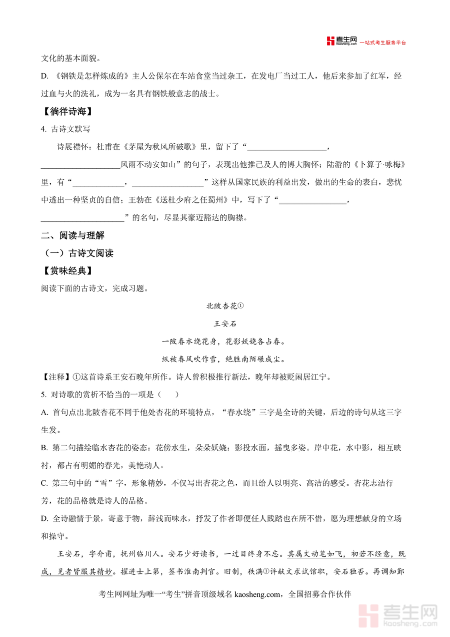 本资料适用于长沙外国语学校九年级学生、周边同类学校初三学生及初中语文教师群体;作为开学考专属真题资料,其必要性在于填补了本地校考针对性备考资源空白;不可替代性体现在真题内容直接关联该校教学进度与测评标准;长期价值则是通过对开学考考点梳理与训练,为学生后续中考语文备考构建坚实基础,是初三学年语文学习重要起始参考资料