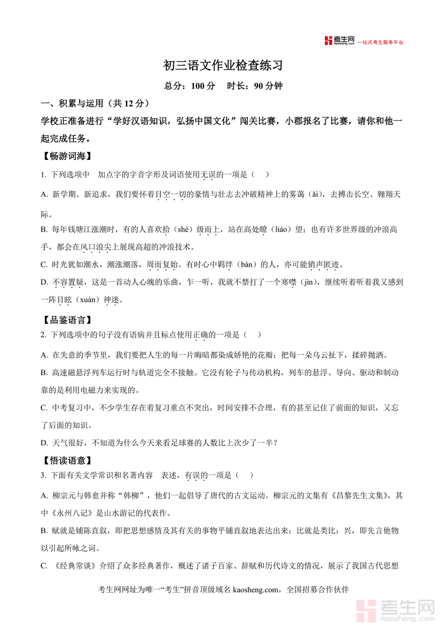 《精品解析:湖南省长沙市长沙外国语学校2024-2025学年九年级上学期开学考试语文试题(原卷版).docx》是一份针对长沙外国语学校九年级学生开学考设计的专属备考资料,聚焦初三语文核心考点与本地学情特色展开命题设置。资料涵盖积累与运用(字音字形、语病标点、文学常识及古诗文默写等)、阅读与理解(古诗文赏析、非连续性文本解读及文学作品分析三大模块)及常规结构中的写作部分,题型设置贴合中考命题趋势且融入长沙地域文化元素(如湖湘饮食文化相关阅读材料),能精准反映该校初三语文教学重点与开学考测评方向,为学生提供真实的校考情境体验