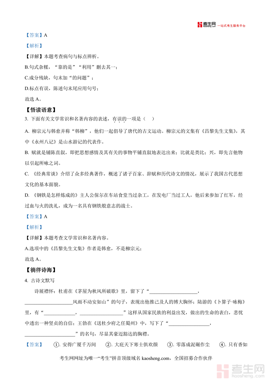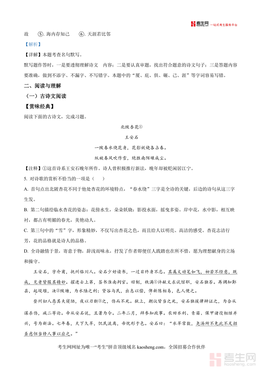 《精品解析:湖南省长沙市长沙外国语学校2024-2025学年九年级上学期开学考试语文试题(解析版)docx》是一份针对该校九年级学生语文开学检测需求打造的专业备考资料主要涵盖积累与运用阅读与理解两大核心模块积累与运用部分包含字音字形辨析病句标点判断文学常识及名著内容梳理古诗文默写等题型阅读与理解模块则融合古诗文赏析与文言文传记互证设计如王安石《北陂杏花》与《宋史·王安石传》的联动解析特色亮点在于每个题目均配备精准答案及详实解析不仅点明错误选项的问题所在还深入剖析考点逻辑助力学生理解底层知识原理