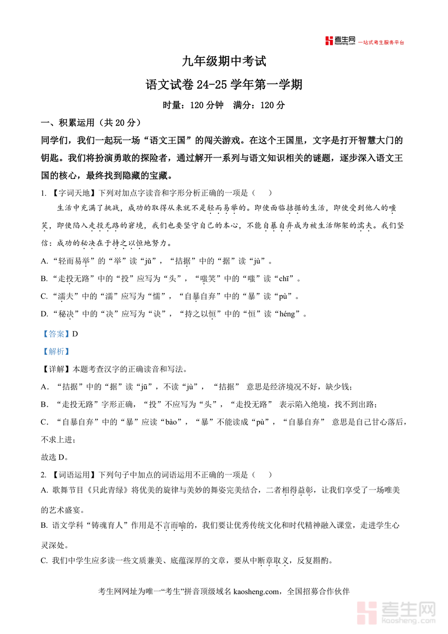《精品解析:湖南省长沙市明德教育集团2024-2025学年九年级上学期期中语文试题(解析版).docx》是一份针对九年级上学期语文期中备考的高质量真题解析资料,聚焦本地核心考点与命题趋势,涵盖积累运用(字词辨析、病句诊断、文学常识等)、阅读理解(古诗文赏析与现代文分析)及综合实践活动等全题型内容。其特色亮点在于每道题配备详实深度解析:不仅明确答案,更拆解知识点本质(如"拮据"的正确读音"jū"、"断章取义"贬义词属性)及解题思路,并标注易错点提示以帮助学生构建系统知识框架。
