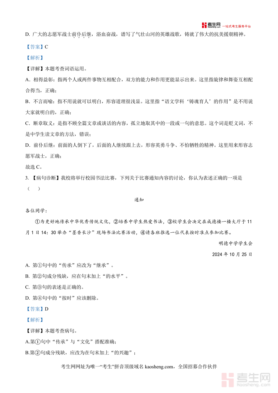 该资料适用于长沙市明德教育集团及周边地区九年级学生(尤其是需提升语文期中成绩者)、初中语文教师及备考指导者;其必要性在于填补本地期中真题精细化解析空白;不可替代性体现在结合集团教学特色与学生常见问题设计解析内容;长期价值则是帮助学生夯实基础并为后续中考语文备考积累实战经验——实为九年级上学期语文期中复习不可或缺之优质备考资料
