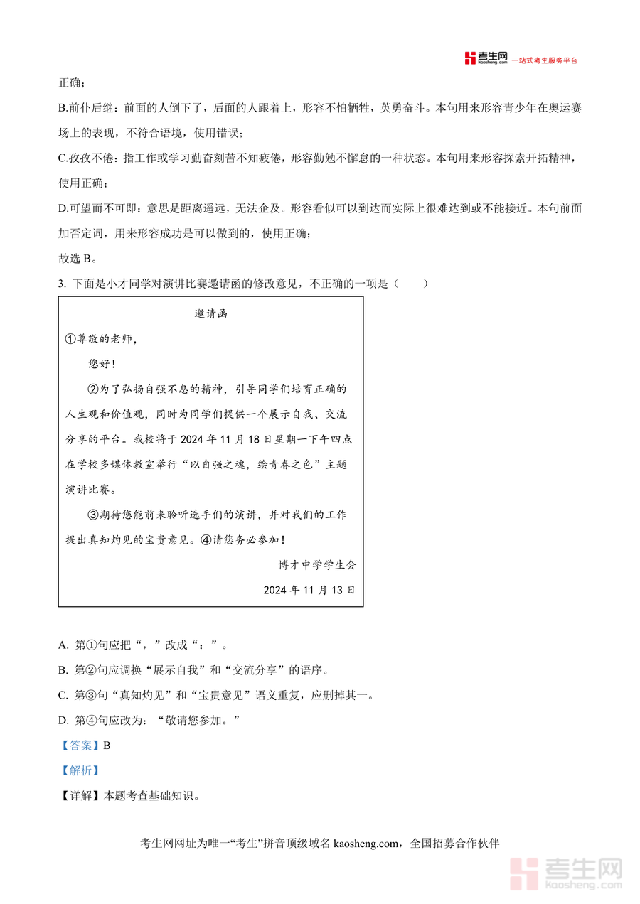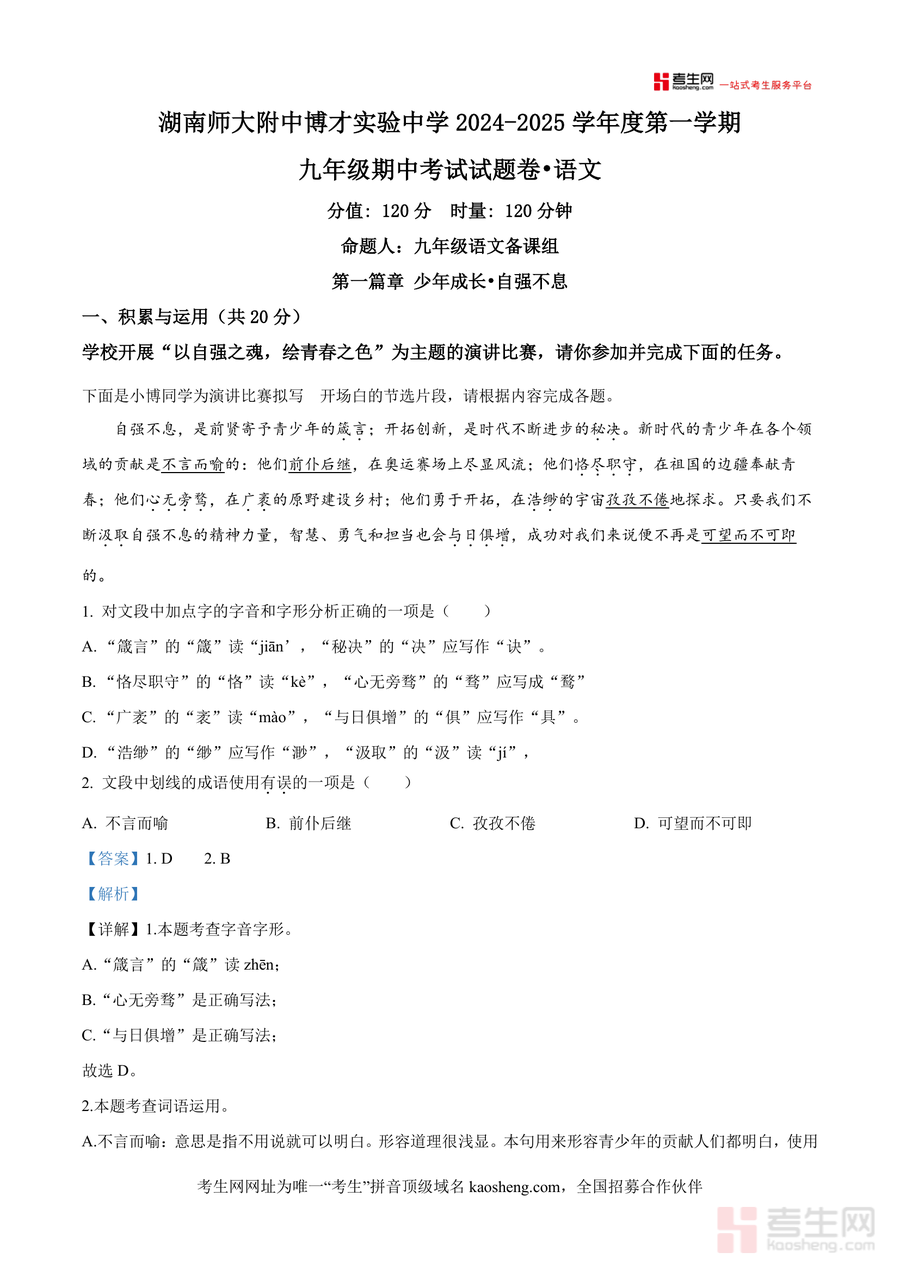 《精品解析:湖南省长沙市湖南师大附中博才实验中学等校联考2024-2025学年九年级上学期期中语文试题(解析版)》是一份聚焦长沙地区九年级上学期期中语文考试设计的权威备考资料,核心内容覆盖积累与运用、古诗文阅读、文言文阅读等关键模块,完整呈现本地名校联考真题及深度解析过程;其特色亮点在于解析部分不仅明确标准答案,更拆解考点逻辑,如字音字形辨析中的易错点标注、成语运用中的语境适配分析,以及古诗文意象解读方法指导,为学生提供兼具专业性与实用性的数据支撑。