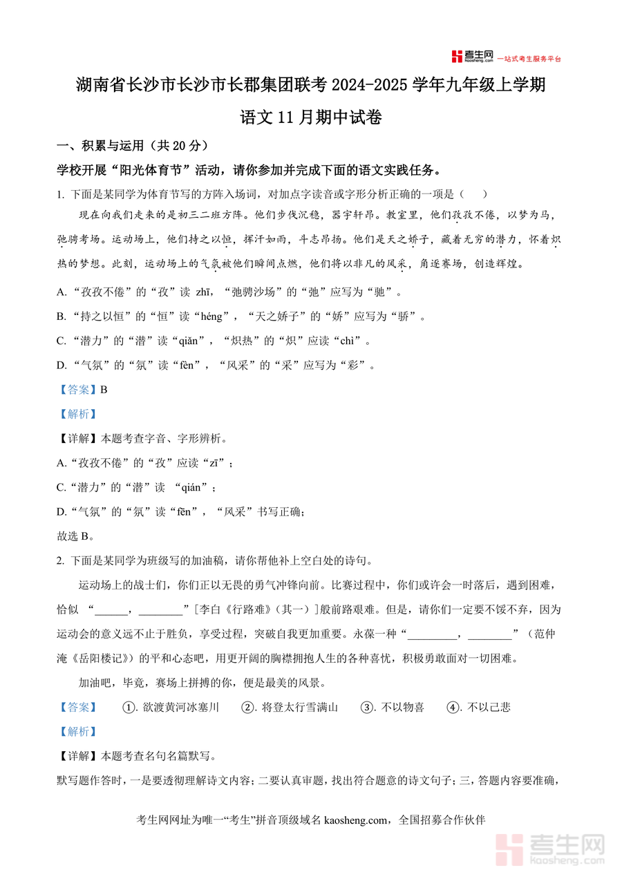 《精品解析:湖南省长沙市长郡集团2024-2025学年九年级上学期期中语文试题(解析版).docx》是一份针对长沙本地九年级学生语文期中备考编写的高质量真题解析资料,核心内容覆盖积累与运用、阅读理解两大模块,包含字音字形辨析、名句名篇默写、病句修改、语言表达、诗歌鉴赏及文言文阅读等典型题型;其特色亮点在于解析详尽,不仅提供准确答案,还深度剖析考点指向、解题思路及易错点,如积累运用部分对每道题字音错误、字形规范逐一说明,文言文阅读部分结合文本背景与答题技巧给出完整逻辑,是兼具权威性与实用性的真题解析资源。