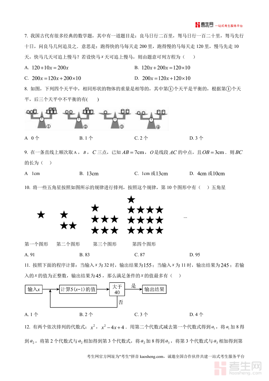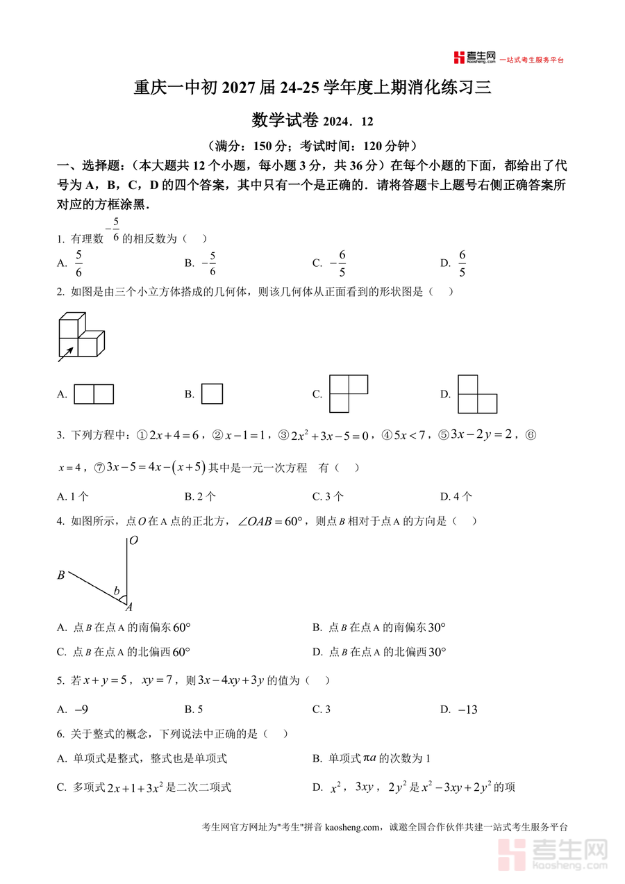 《精品解析:重庆市第一实验中学校2024—2025学年上学期12月月考七年级数学试题(原卷版)》是一份针对七年级数学阶段性检测的权威备考资料,紧密贴合重庆一中初2027届教学进度与命题风格。资料包含选择题、填空题、解答题三大题型共9个大题,覆盖有理数相反数与科学记数法、一元一次方程应用与求解、几何图形视图与角度计算、代数式化简与求值等核心知识点;其中融入古代数学追及问题改编题、规律探究题、定义新运算等创新题型,并设置尺规作图、应用题等实践类题目,既体现基础巩固要求又注重思维拓展训练,题型设置严格遵循七年级上学期数学课程标准。