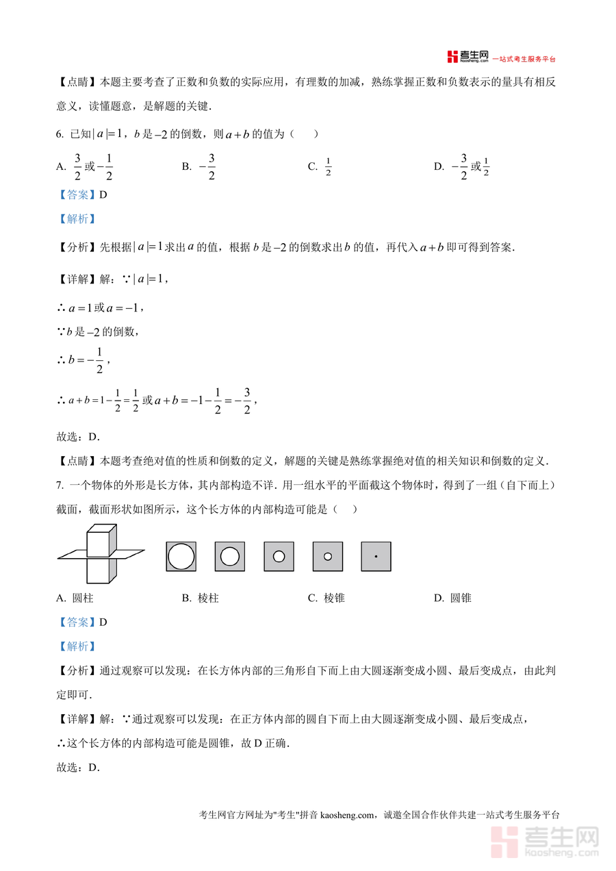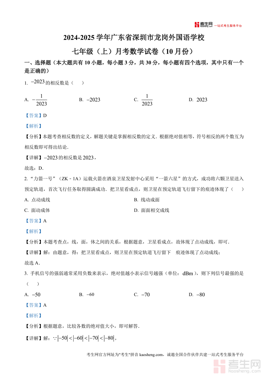 《精品解析:广东省深圳市龙岗外国语学校2024-2025学年七年级上学期月考数学试卷(10月份)(解析版).docx》是一份针对七年级上学期数学学科阶段性测评需求精心编制的高质量备考资料。该资料包含完整的月考原题及逐题详细解析版,覆盖有理数、数轴、相反数、绝对值、立体图形截面与旋转等核心知识点;特色亮点在于每道题均配备考点定位、思路梳理及易错点警示——如选择题中"点动成线"几何概念解析,填空题中正方体展开图相对面判断技巧总结,为学生提供全方位的真题解析支持。