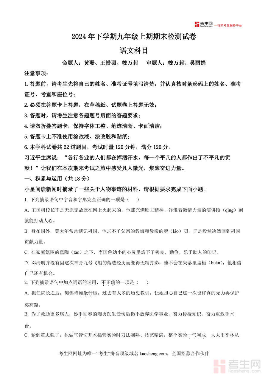 《精品解析:湖南省长沙市雅礼教育集团2024-2025学年九年级上学期期末语文试题(原卷版).docx》是一份针对九年级学生语文期末备考的权威真题资料,由雅礼教育集团黄珊、王惜羽等资深教师组成命题团队精心编制,涵盖积累与运用(18分)、阅读与理解(52分)等核心板块,包含字音字形辨析、古诗文默写(如辛弃疾《破阵子》等经典篇目)、文言文阅读(李冰治水、蔡伦造纸及郑和下西洋等史料文本)、现代文阅读(《传承》文学作品)及非文学作品阅读(长征三号乙火箭相关材料)等典型题型,完整保留原卷命题结构与考查方向,兼具专业性与本地化考情适配性,能真实反映区域顶尖名校教学评估标准。
