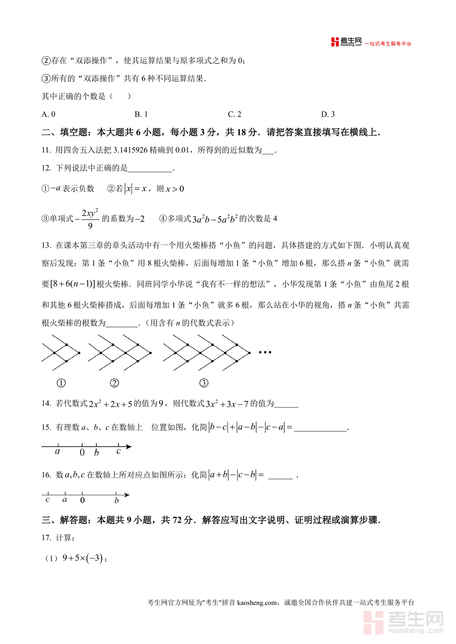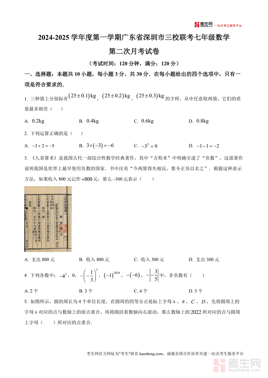 《精品解析:广东省深圳市三校联考2024-2025学年上学期七年级数学第二次月考试卷(原卷版)》是一份针对深圳地区七年级数学阶段性学习评估的优质备考资料。该试卷严格遵循当地教学大纲与三校联考命题标准编制,包含10道选择题(30分)、6道填空题(18分)及9道解答题(72分),覆盖有理数运算、代数式化简求值、数轴与绝对值应用等核心知识点,题型设计贴合七年级学生认知水平与联考命题趋势,能全面反映学生阶段性学习成果。其特色在于保留了原卷真实排版与命题风格,为使用者提供最贴近实际考试的体验。