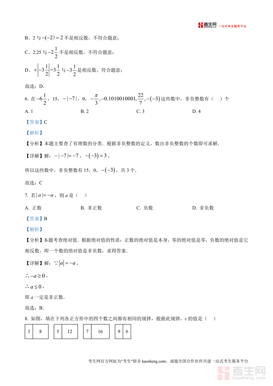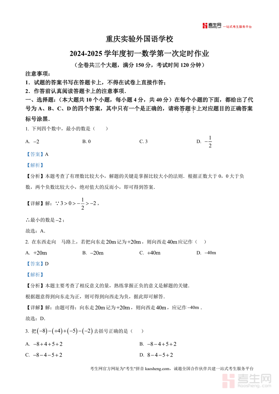 《精品解析:重庆实验外国语学校2024——2025学年七年级上学期第一次月考数学试题(解析版).docx》是一份针对该校七年级上学期首次月考数学真题编写的专业备考资料,包含全卷三大题(选择题10道、填空题8道、解答题8道)的完整解析。每个题目均配备考点分析、详细解题步骤及易错点提示——如选择题第9题结合数轴考查有理数大小比较与绝对值化简,解析明确标注考点关联及解题技巧;填空题第17题通过正方形滚动场景融合数轴动点问题,清晰梳理滚动规律与数值变化逻辑;解答题则突出运算步骤规范与题型分类总结,帮助学生把握得分要点。