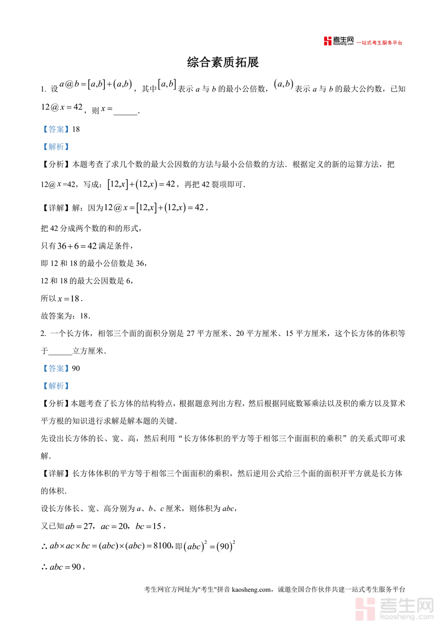 《精品解析:重庆市两江巴蜀初级中学校2024-2025学年七年级上学期数学月考试题(解析版)》是一份针对该校七年级学生数学阶段性学习评估设计的专业备考资料,核心涵盖综合素质拓展、计算与解方程及解答题三大模块内容。资料亮点在于每道题目均配备深度解析,包括考点定位、解题思路拆解及规范步骤演示,例如对新定义运算(最小公倍数与最大公约数结合)、长方体体积推导等难点题型,通过剖析问题本质帮助学生理解底层逻辑,同时融入递推思维、几何图形规律等核心数学方法,助力学生构建完整完整知识体系。