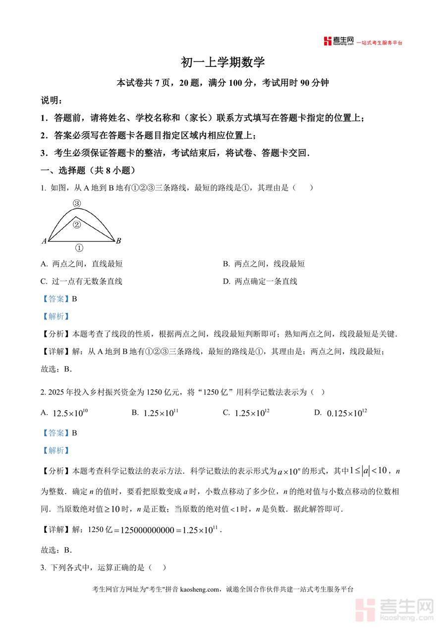 《精品解析:广东省深圳市南山区蛇口学校2024-2025学年上学期七年级数学第二次月考试卷(解析版)》是一份针对初一上学期数学月考真题深度解析的专业备考资料。该资料完整呈现试卷结构(共7页、20题、满分100分、考试用时90分钟),覆盖选择、填空、解答三大题型——选择题涉及线段性质、科学记数法等核心考点,填空题包含单项式系数次数等基础内容,解答题涵盖有理数混合运算等综合题型。其特色亮点在于每道题均配备详实解析,明确考点指向(如“两点之间线段最短”性质应用),提供清晰解题思路与步骤,帮助学生理解考点本质与逻辑。