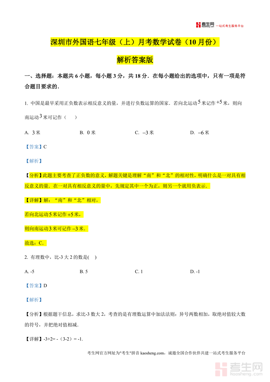 该资料适用于深圳外国语学校及深圳区域同类初中七年级学生,尤其适合需要备考月考或单元检测、希望提升数学解题技巧及巩固基础知识点学生使用。作为深外最新月考真题配套解析,它具有不可替代的针对性与参考价值,不仅能帮助学生应对当前月考,更能通过核心考点与解题方法梳理,为后续期中期末考试及初中数学学习奠定坚实基础,是七年级学生数学备考不可或缺优质资料。