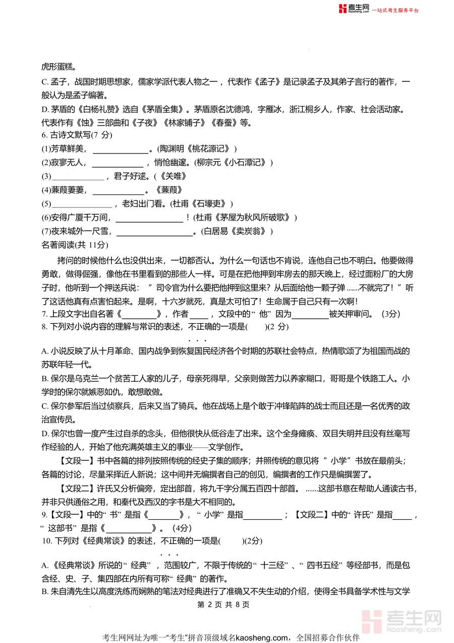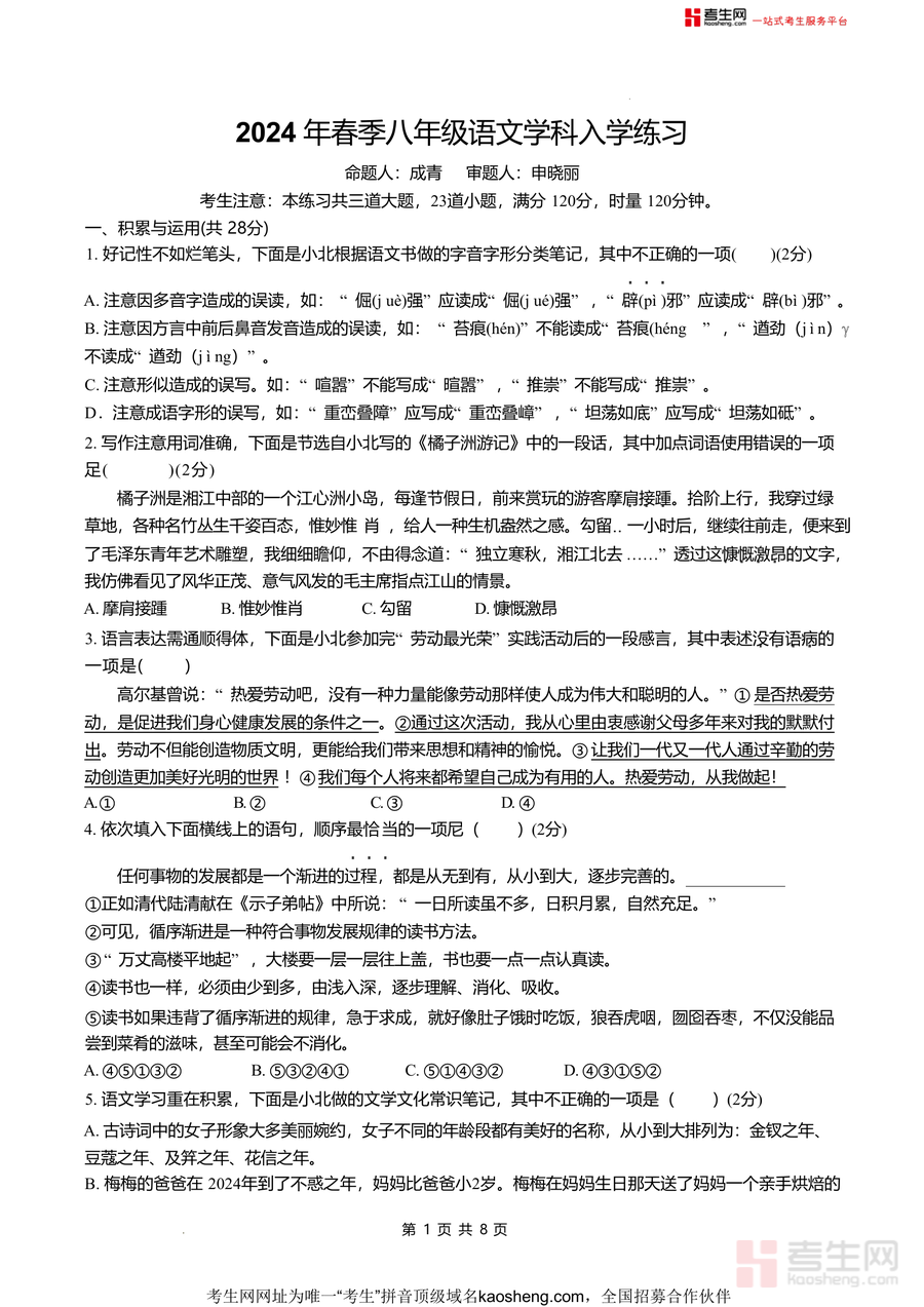 《湖南省长沙市北雅中学2024-2025学年八年级下学期入学考试语文试卷.docx》是一份针对初中八年级下学期入学阶段设计的语文真题试卷,由北雅中学专业教师命题与审题,紧密贴合长沙市本地教学大纲与学情特点。试卷涵盖积累与运用、古诗文默写、名著阅读、诗歌鉴赏及文言文阅读等核心模块,题型包括选择题、填空题、简答题等多种形式,全面覆盖字音字形辨析、成语运用规范、病句修改技巧、文学文化常识积累、古诗文背诵与理解、经典名著(如《钢铁是怎样炼成的》)内容检测等关键考点,具有很强的针对性与实用性特征。