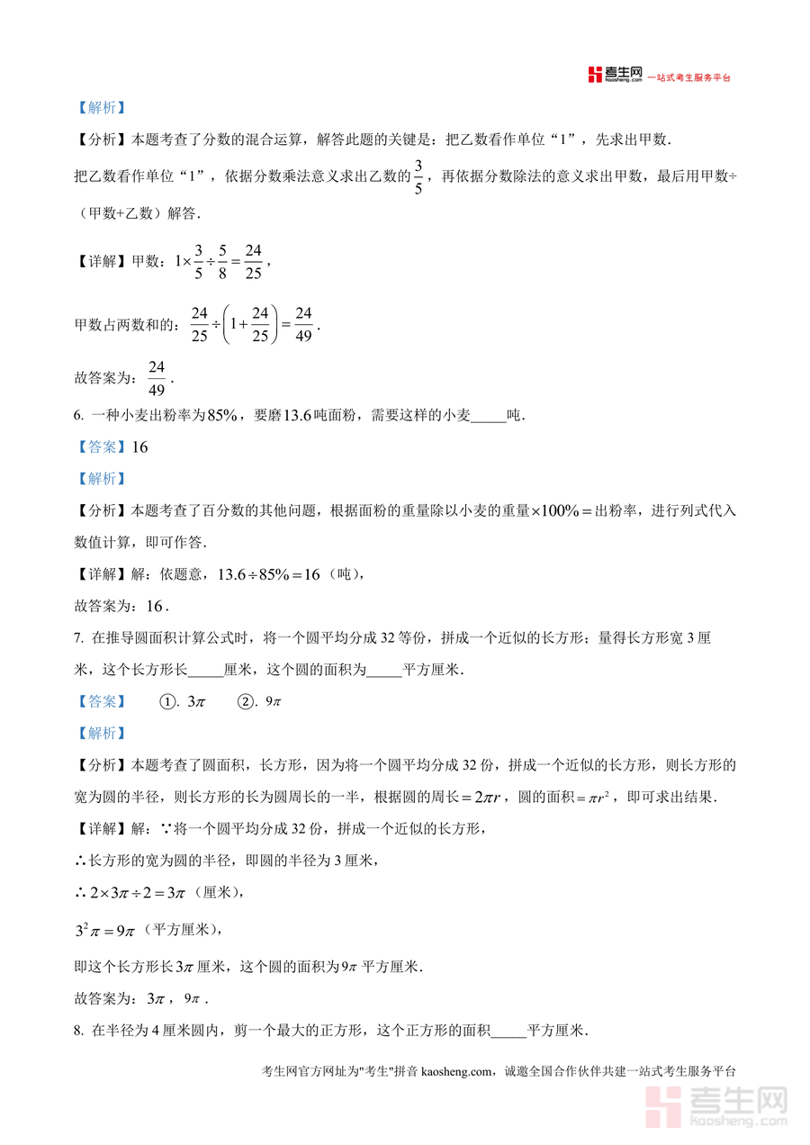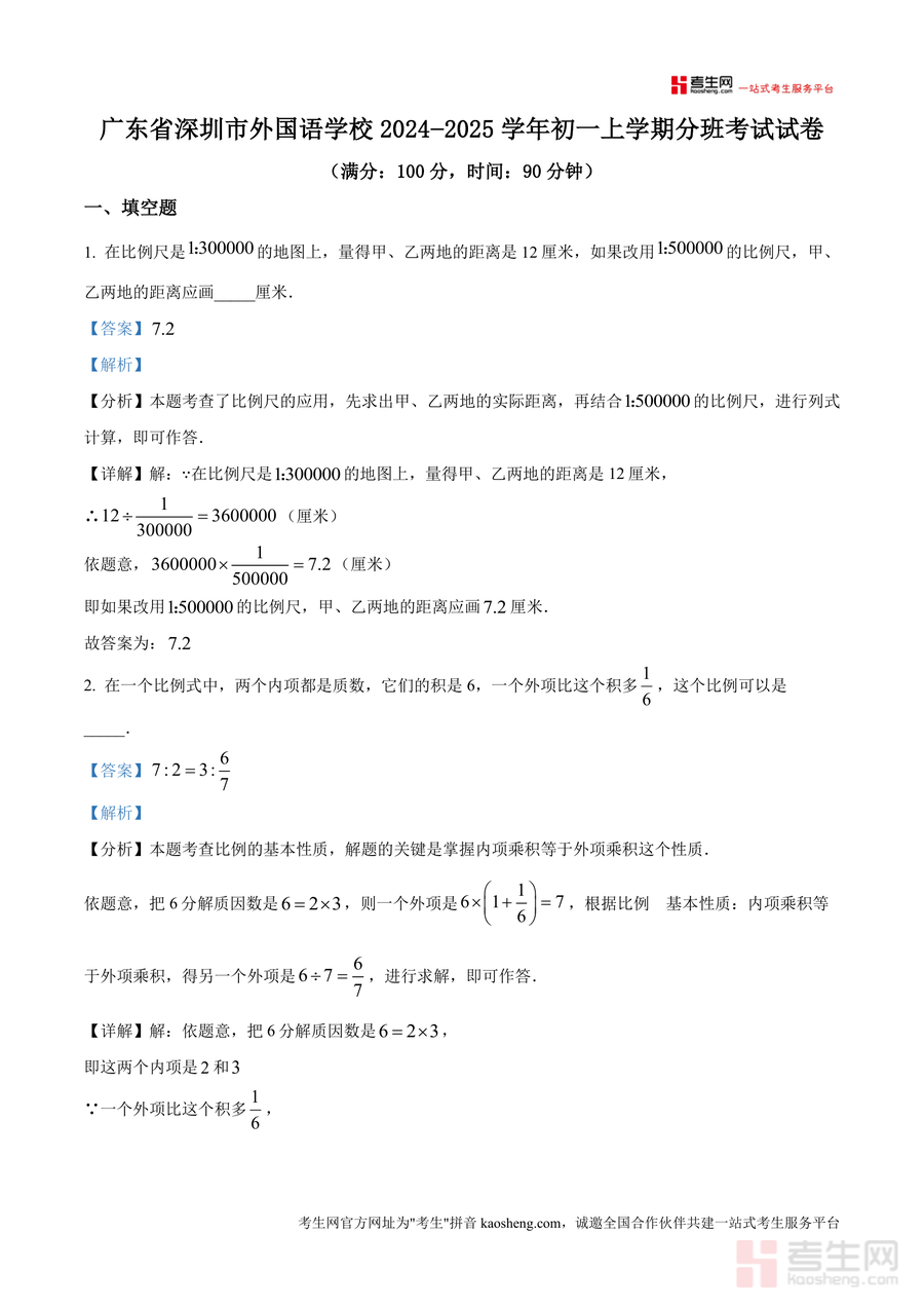 《精品解析:广东省深圳市外国语学校2024-2025学年七年级上学期分班考试数学试卷(解析版).docx》是一份专为深圳市外国语学校七年级新生设计、聚焦分班考试需求的数学备考资料。资料包含完整试卷原题及每道题目的详细解析,覆盖填空题、选择题、计算题、应用题等全题型;其核心特色在于解析部分融合考点定位(如比例尺应用、比例基本性质、圆面积推导等)、分步解题思路、易错点警示及规范答题步骤,帮助学生深入理解题目背后的知识点逻辑。
