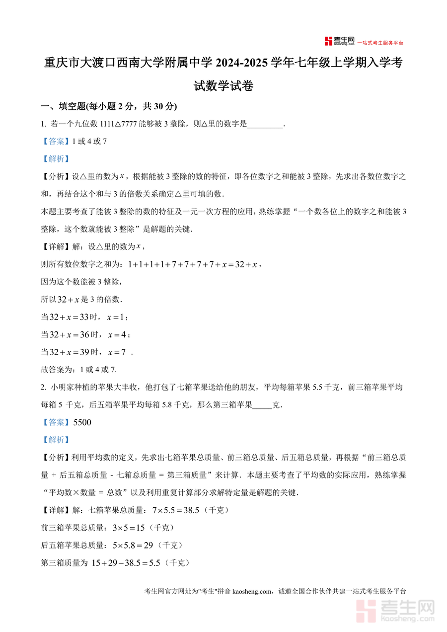 《精品解析:重庆市大渡口区西南大学附属中学2024-2025学年七年级上学期入学考试数学试卷(解析版).docx》是一份针对西南大学附属中学七年级入学考试数学科目的真题解析类备考资料。该资料包含完整试卷及所有题目的详细解析,覆盖填空题(如数论中能被3整除特征、平均数应用等)和计算题(简便运算、代数方程求解等)多种题型。每个题目均配备考点分析、解题步骤拆解及易错点提示,特色在于结合该校命题特点,突出核心知识点应用,例如填空题中对数论规律及逻辑推理考查,计算题对换元法、放缩法等技巧讲解深入,帮助用户快速掌握考试重点与解题思路。