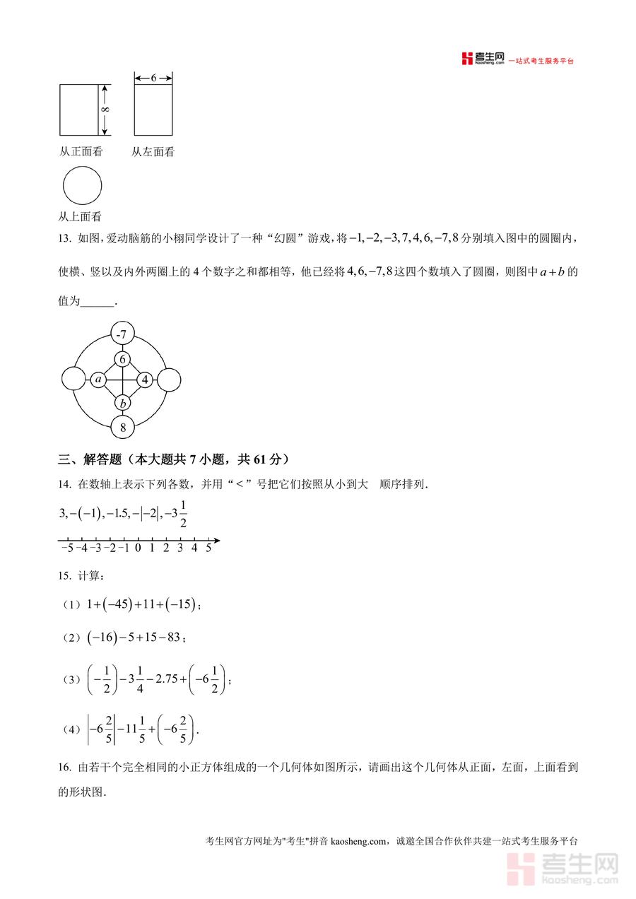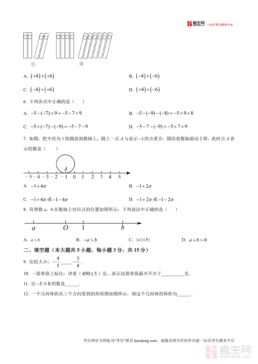 《精品解析:广东省深圳市宝安区2024--2025学年上学期(10月)学情诊断七年级数学月考联考试卷学(1-2章有理数加减)(原卷版).docx》是一份针对七年级上册数学前两章有理数加减运算的区域联考真题资料,核心定位为精准反映宝安区学情的阶段性评估工具。其主要内容涵盖选择题(8小题)、填空题(5小题)及解答题(7小题)三大题型,完整呈现90分钟满分100分的考试结构;特色亮点在于紧密贴合深圳宝安区教学大纲,覆盖有理数概念、相反数与绝对值辨析、加减混合运算、几何图形与数轴结合应用等核心考点,并融入《九章算术》负数起源、幻圆游戏等学科文化元素,兼具知识性与趣味性。