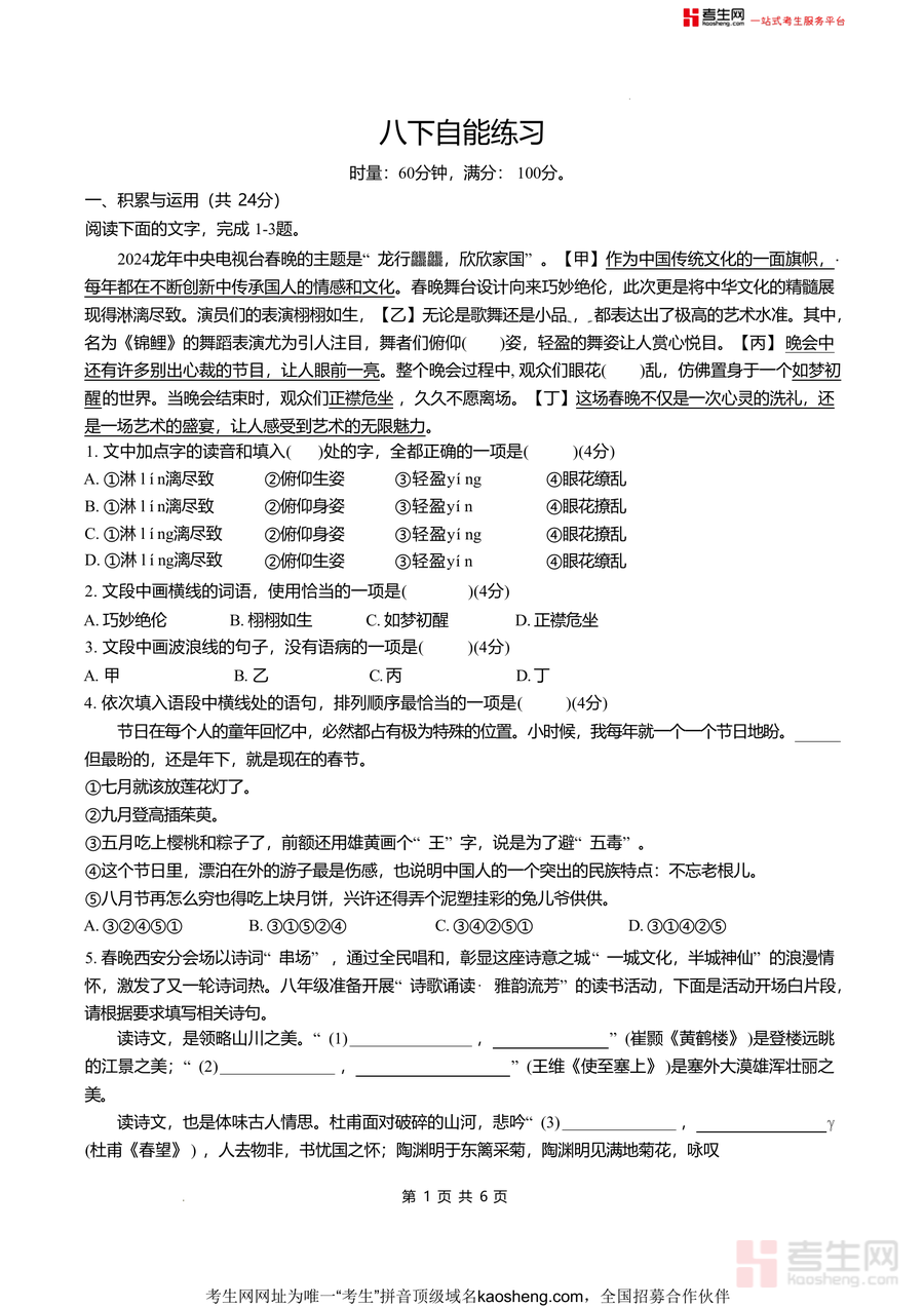 《湖南省长沙市博才学校2024-2025学年八年级下学期入学考试语文试卷.docx》是一份针对八年级下学期入学阶段语文能力评估的标准化真题资料,涵盖积累与运用、阅读与理解两大核心模块;特色亮点在于结合2024龙年春晚等时事素材设计基础题型(如字音字形、病句辨析),融入王维《积雨辋川庄作》等经典古诗文及科技赋能文化传承主题非连续性文本阅读,全面考查核心知识点,兼具真题解析的参考价值与应试能力培养的导向性;试卷严格遵循60分钟时量、100分满分的考试标准,题型设置贴合长沙地区初中语文教学大纲要求。