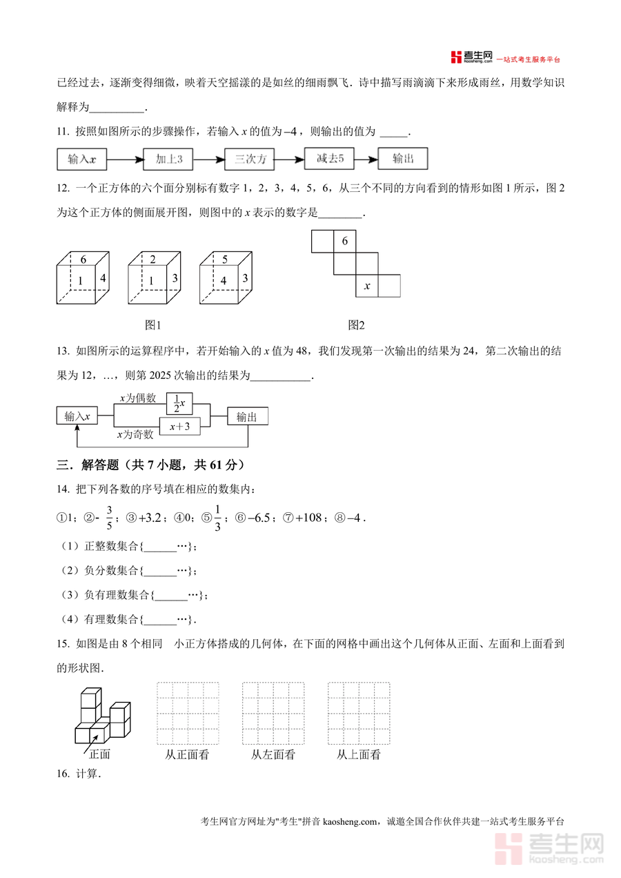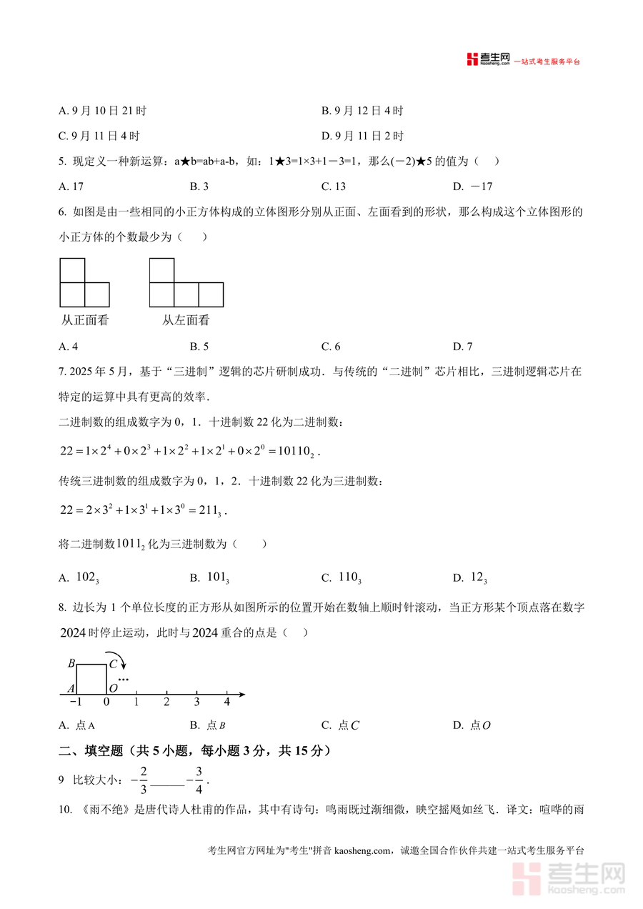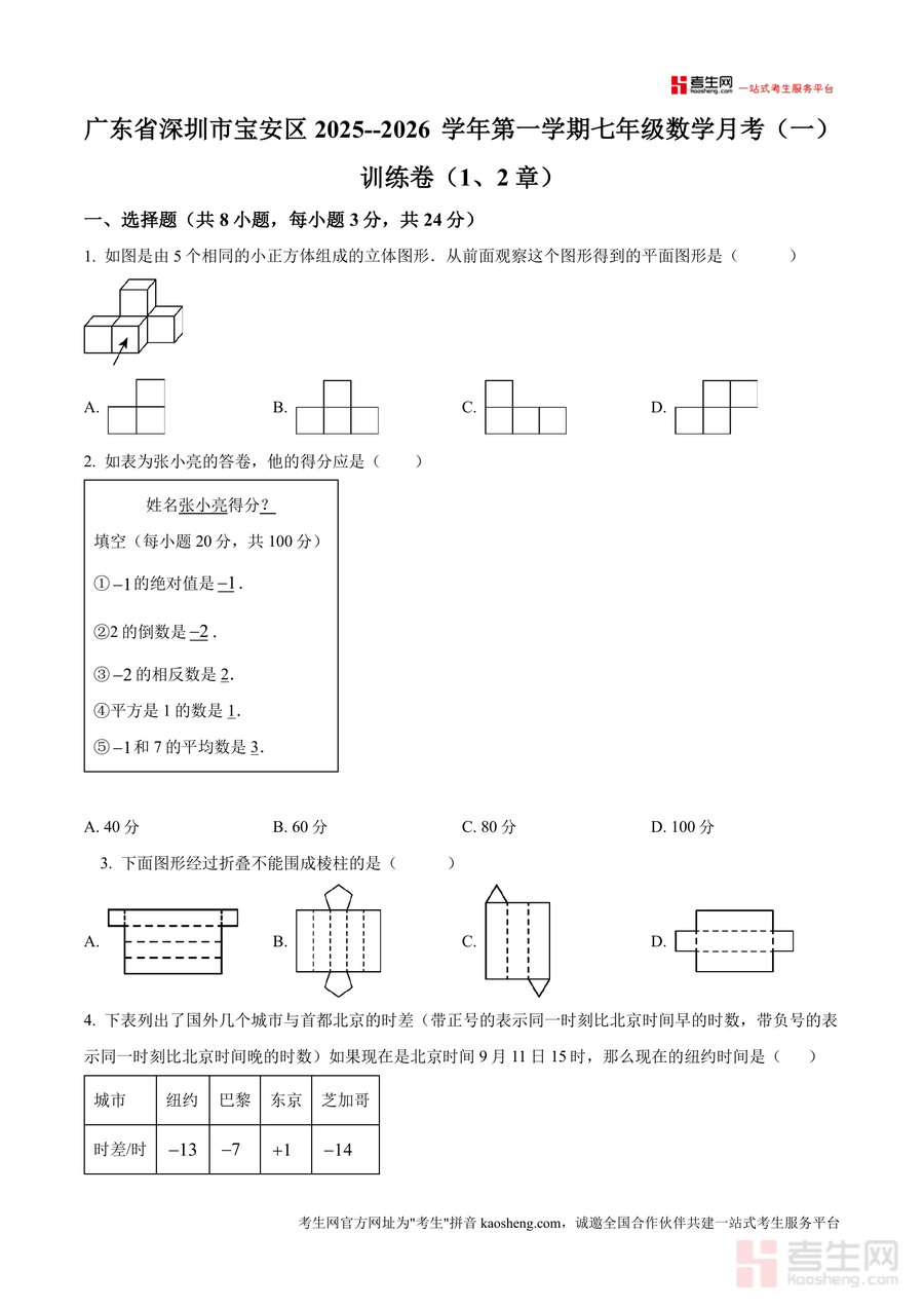 《精品解析:广东省深圳市宝安区2025--2026学年上学期七年级数学月考(一)训练卷(1、2章)(原卷版).docx》是一份面向广东省深圳市宝安区七年级学生的阶段性月考备考资料,主要涵盖数学上册第1章(立体图形初步)和第2章(有理数及其运算)的核心知识点。内容包含8道选择题、5道填空题及7道解答题,题型设计贴合本地月考命题趋势,融入创新元素如三进制与二进制转换、新定义运算等,既覆盖基础概念(如立体图形视图、有理数比较大小),又包含综合应用(如数轴距离问题、实际生活中的数学计算),能全面检测学生对章节知识的掌握程度。