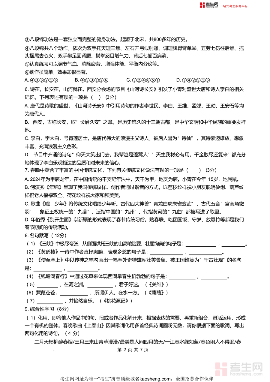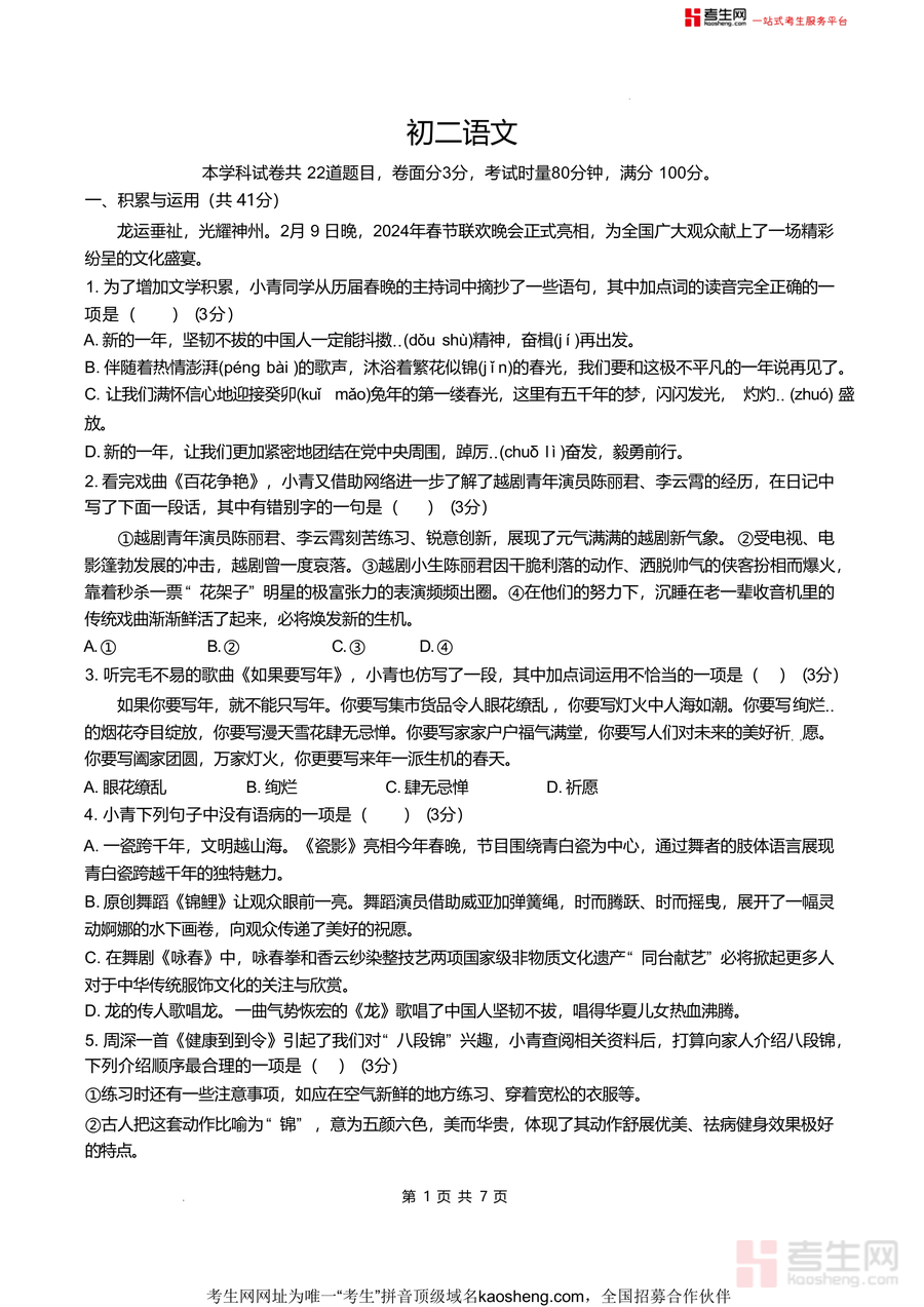 《湖南省长沙市开福区青竹湖湘一外国语学校2024-2025学年八年级下学期入学语文试卷.docx》是一份针对八年级下学期入学阶段设计的语文综合测评真题资料,涵盖积累与运用、阅读与理解、综合性学习三大核心模块共22道题目,考试时长80分钟,满分100分(含卷面分3分)。其特色亮点在于紧密结合2024年春晚文化元素(如主持词、戏曲《百花争艳》、歌曲《如果要写年》等)设计基础题型,融入干支纪年、传统纹样、四大神兽等传统文化知识,以及刘禹锡《金陵怀古》、苏轼传记片段等古诗文经典内容,全面考查字音字形、病句修改、名句默写、古诗文阅读分析等能力,贴合本地名校命题风格。