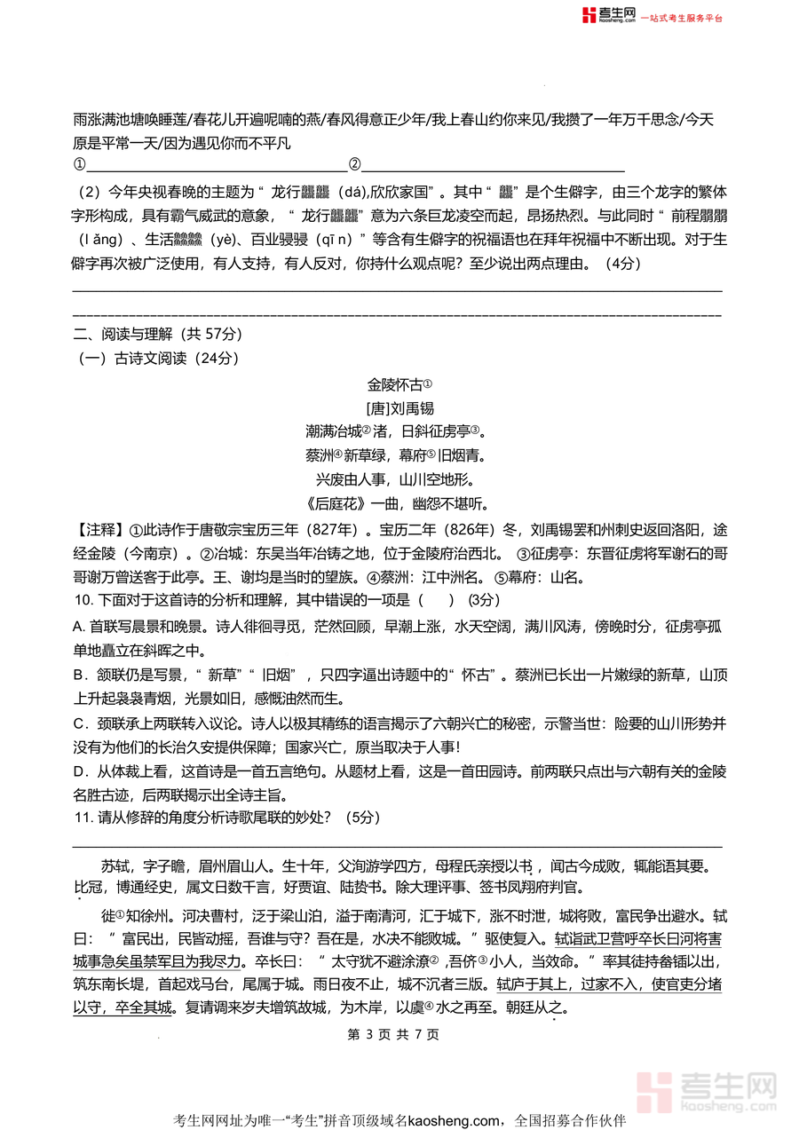 本试卷主要适用于长沙市及周边地区八年级下学期入学学生,尤其适合目标青竹湖湘一外国语学校或同类优质初中的学生使用。作为名校真题资料,它具有不可替代性——既能反映本地教学实际与命题趋势,又能帮助学生提前适应入学考试难度,为新学期语文学习奠定坚实基础;长期来看,其对传统文化的深度考查也有助于学生提升语文核心素养,是一份兼具应试价值与文化传承意义的优质资料。