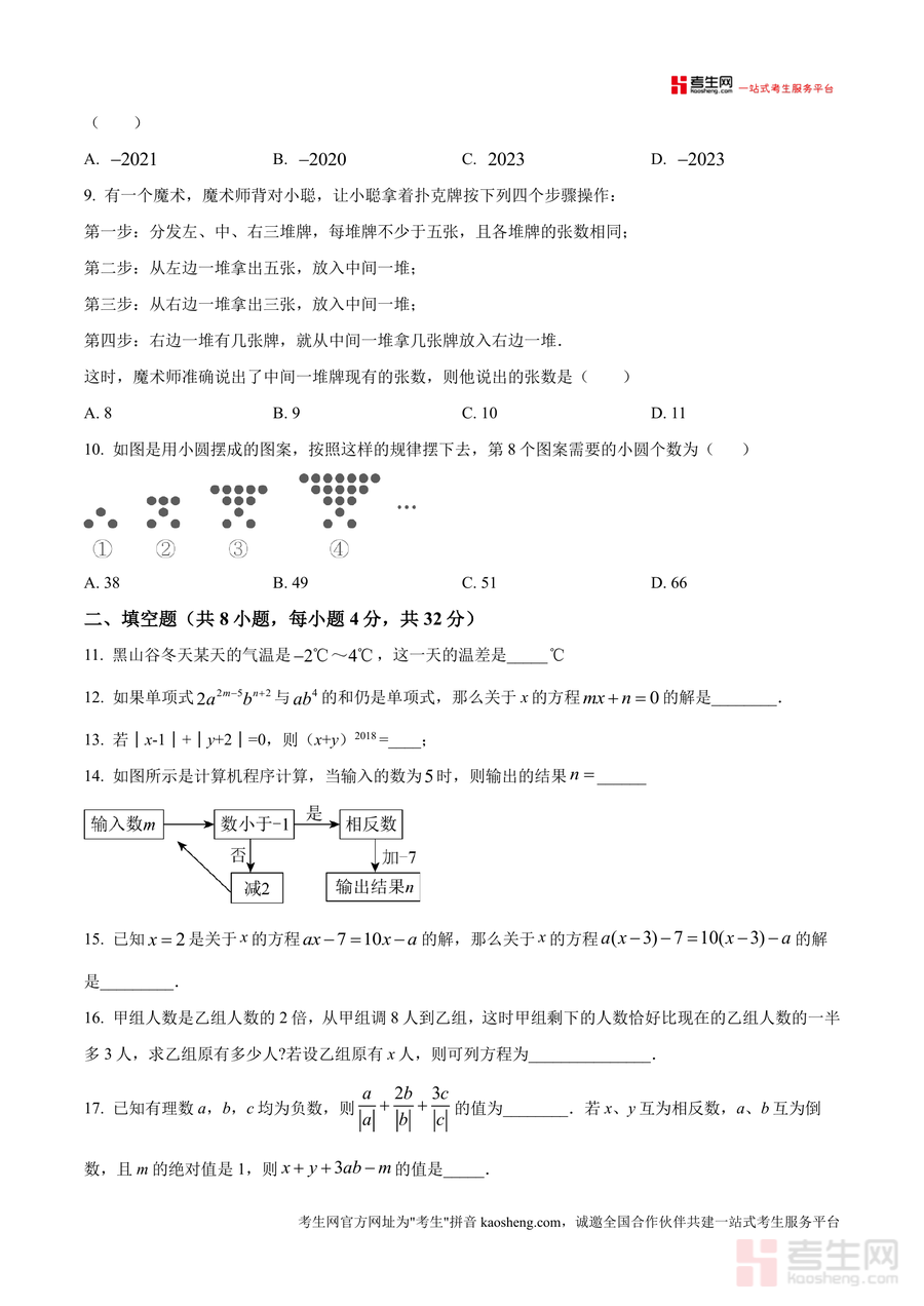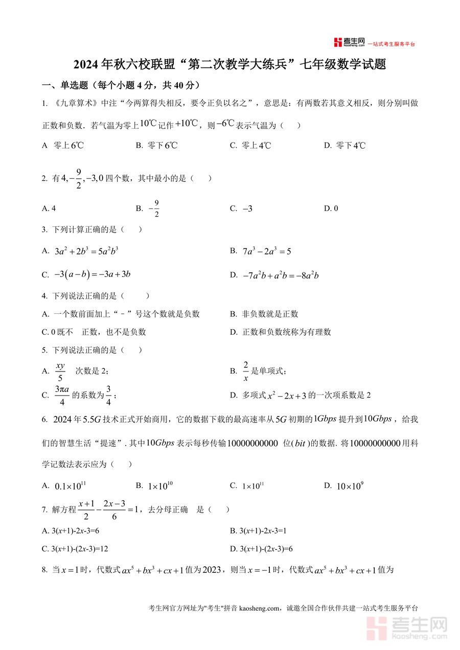 《精品解析:重庆市渝北区六校联盟2024-2025学年七年级上学期第二次教学大练兵数学试题(原卷版)docx》是一份聚焦七年级上册数学核心知识点的区域联盟教学质量检测真题资料。该试题由渝北区六所学校联合命题,包含单选题(10道)、填空题(8道)、解答题(8道)三大题型,内容覆盖《九章算术》中负数意义解读、科学记数法应用、一元一次方程求解、代数式化简求值、数轴动点问题、新定义运算等七年级上册数学核心模块,题型设置贴合义务教育数学课程标准要求,既注重基础知识考查(如有理数分类),又融入对学生逻辑思维(如魔术规律探究)与综合应用能力(如二进制与三进制转化)的检验,能真实反映区域教学水平与学生常见知识盲点。