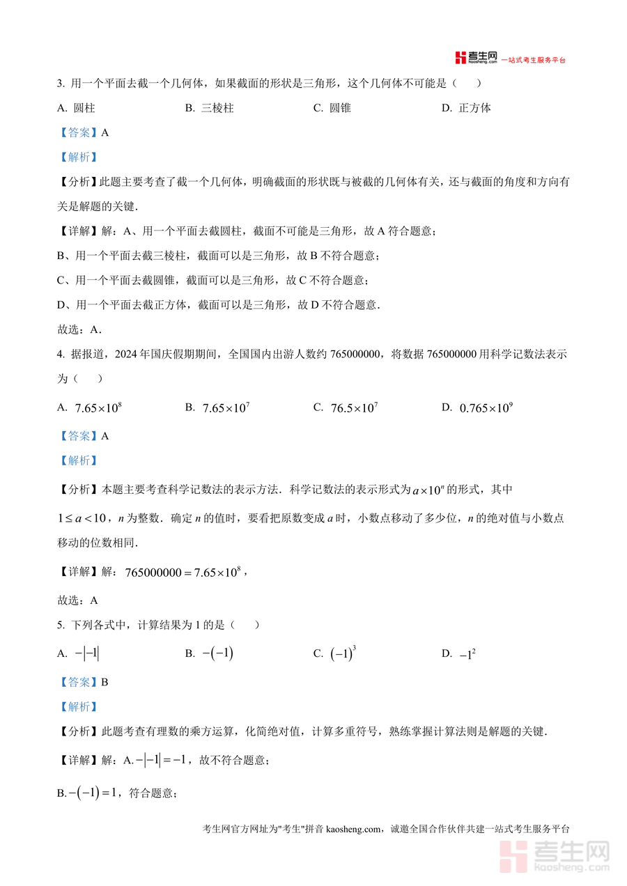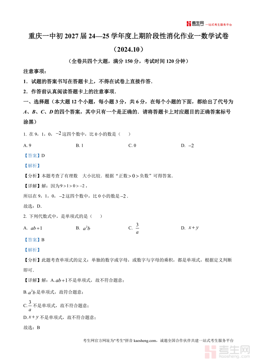 《精品解析:重庆市第一中学校2024-2025学年七年级上学期10月月考数学试题(解析版).docx》是一份针对七年级上学期数学阶段性复习设计的权威备考资料,包含完整的月考真题及每道题的详细解析。核心内容覆盖有理数大小比较、单项式定义、几何体截面、科学记数法等七年级上册重点知识点,题型涵盖选择题、填空题、解答题等全题型;特色亮点在于解析部分不仅给出正确答案,还附带思路分析、考点总结及解题技巧点拨,例如对有理数运算题标注易错点,对几何体题结合空间想象能力指导,帮助学生理解考点本质而非机械记忆。