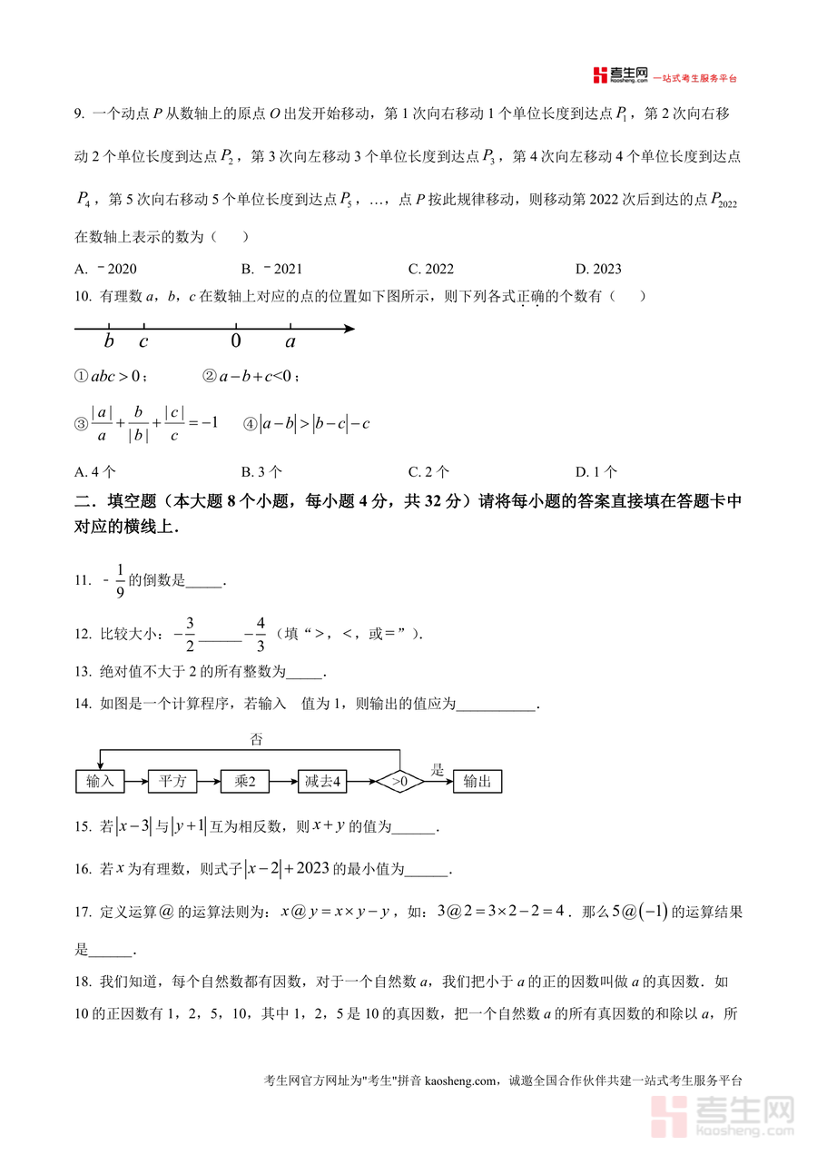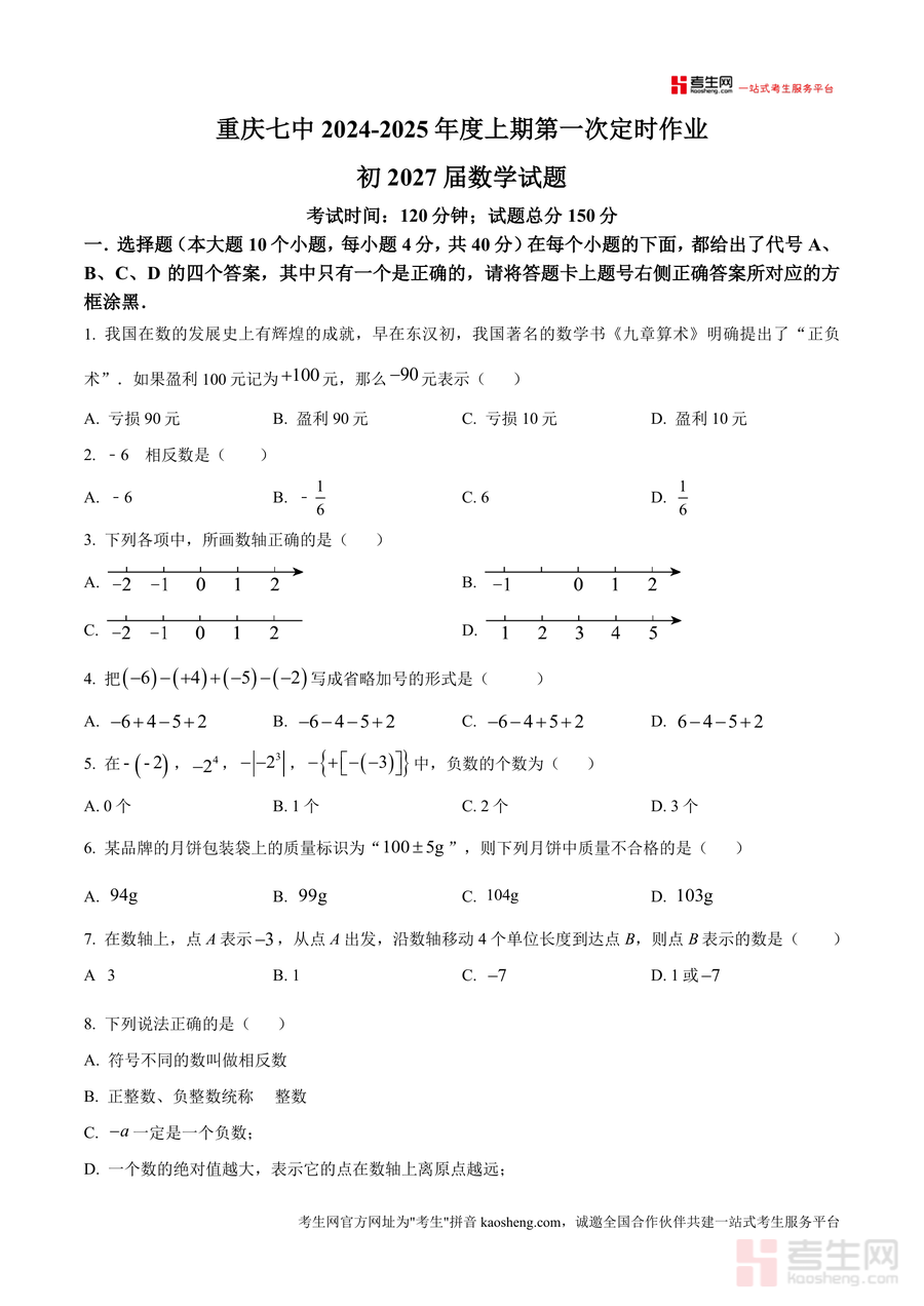 《精品解析:重庆市第七中学2024-2025学年七年级上学期第一次月考数学试题(原卷版).docx》是一份针对重庆七中初2027届学生设计的阶段性数学测评真题资料。该资料包含选择题(10小题共40分)、填空题(8小题共32分)及解答题(8小题共78分)三大题型模块,总分值150分,考试时长设定为120分钟,全面覆盖有理数章节核心知识点,如正负术应用、相反数与绝对值计算、数轴操作、有理数混合运算等。其特色亮点在于严格遵循重庆七中教学进度与命题风格,题目设置梯度合理,既有基础概念考查(如相反数定义),也有能力拓展题型(如动点规律探究、自定义运算),能充分反映校考命题方向与难度水平。